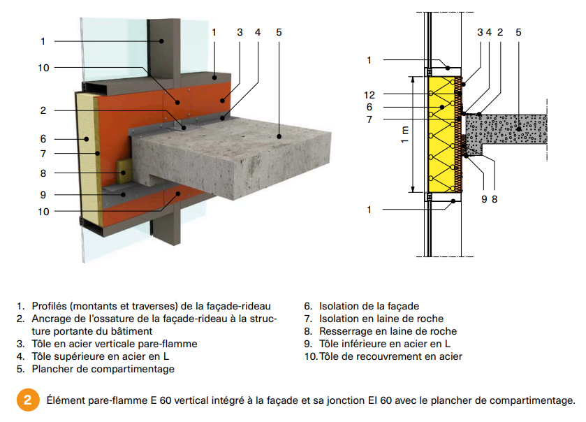 L’une des solutions décrites dans la NIT consiste à intégrer l’élément pare-flamme E 60 de 1 m à la façade-rideau au droit du plancher de compartimentage (2).