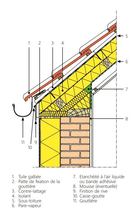 Il en résulte un accroissement de l’espace entre la gouttière et la couverture dont l’impact sur l’aspect du pied de versant est plus important encore si la couverture est formée de tuiles galbées ou si l’on décide de ne pas modifier la hauteur des évacuations d’eaux pluviales malgré l’ajout de matériau isolant sur le toit (voir photo).