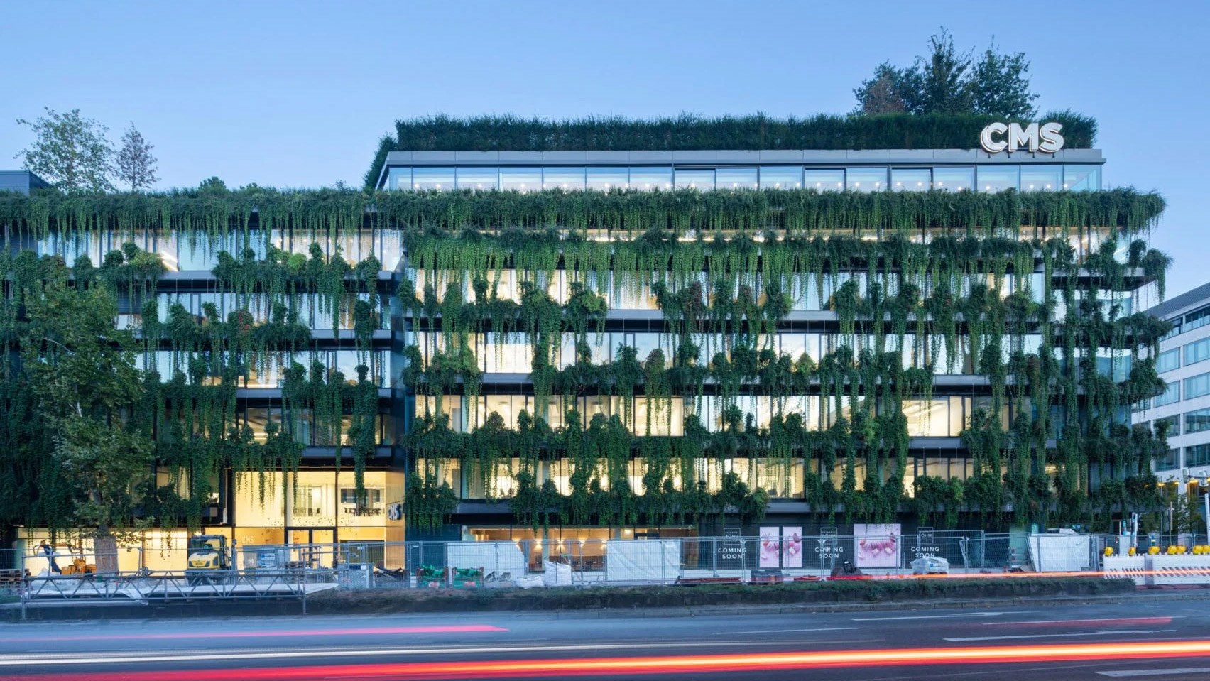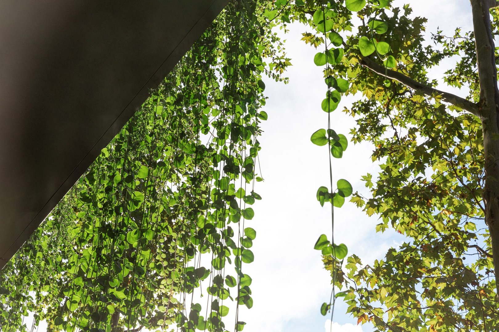 La toiture accueille un jardin accessible depuis une salle de conférence vitrée, tandis que les appartements bénéficient de terrasses privées légèrement en contrebas des bureaux. Plus de 40 arbres ont été plantés sur le toit et le long de la rue en contrebas. Les plantes grimpantes et retombantes, maintenues par des câbles et des filets, ont été sélectionnées pour leur adaptation régionale, leur activité saisonnière et leurs faibles besoins d’entretien.