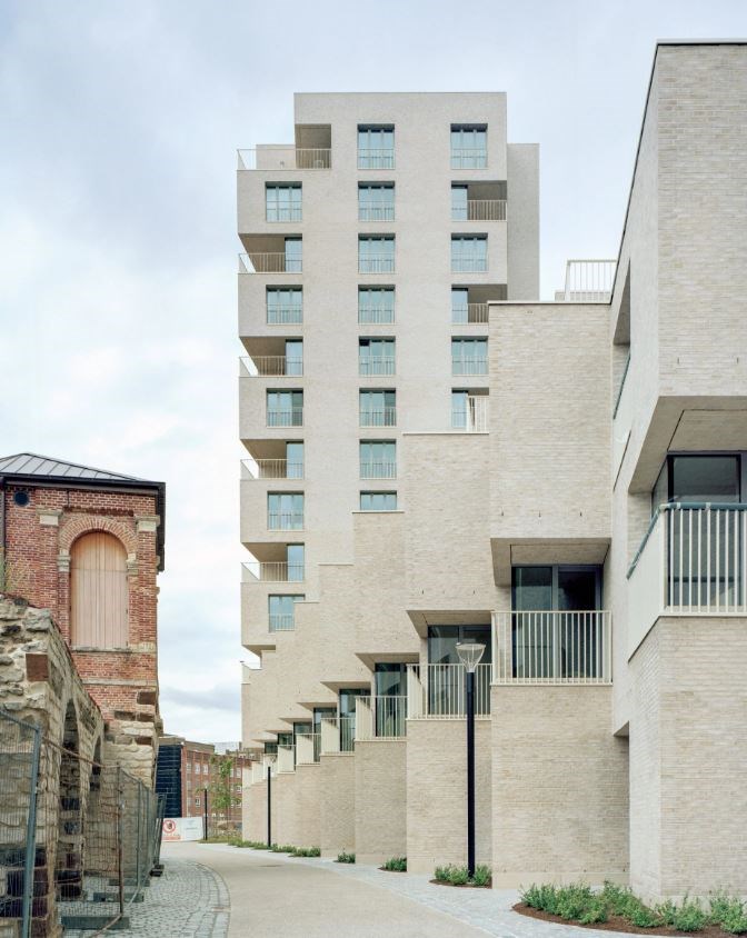 Le complexe se termine par un immeuble d'appartements de quatre étages, qui contient des logements plus petits et forme un lien entre les maisons de ville et un bâtiment existant sur le site.