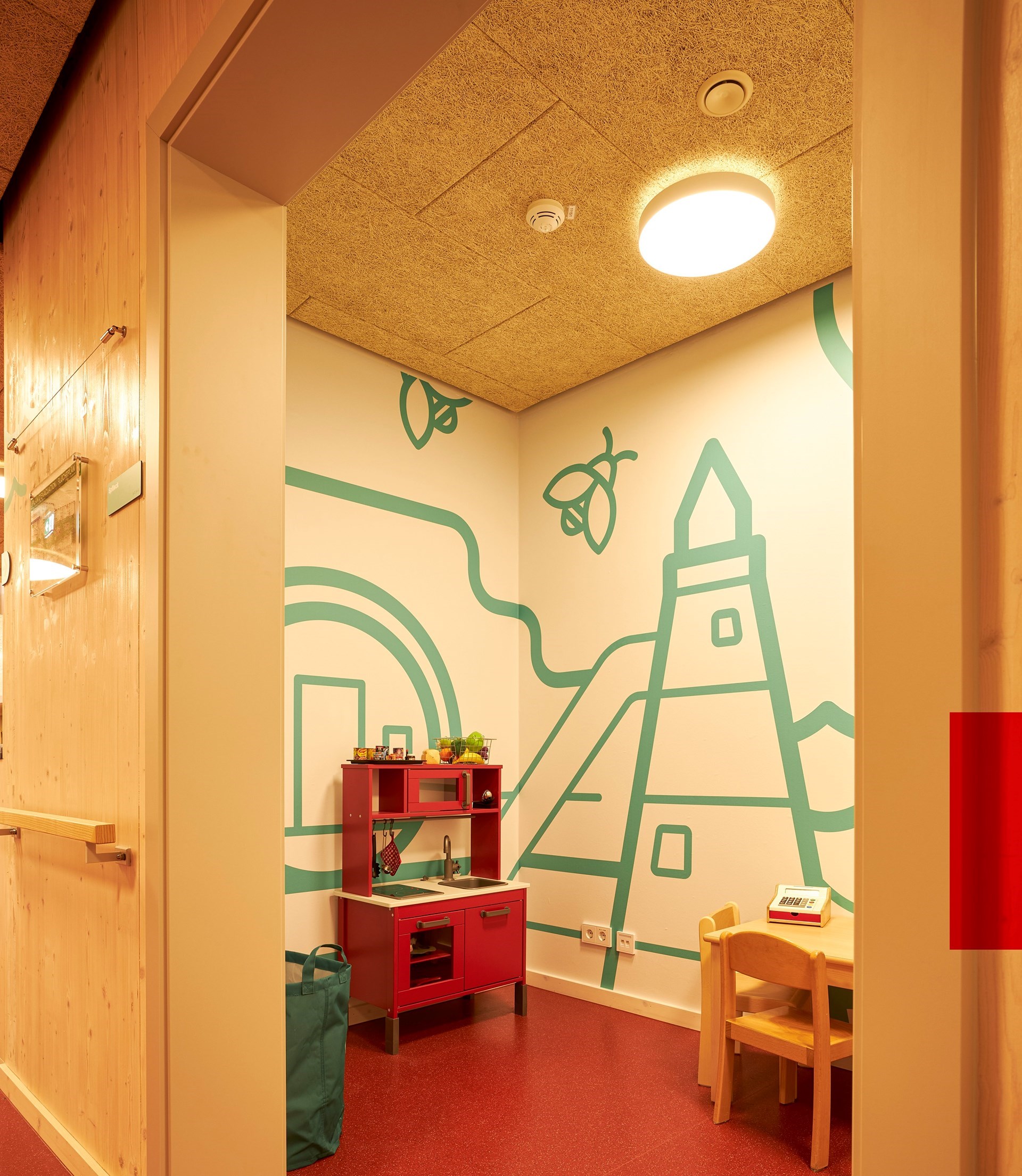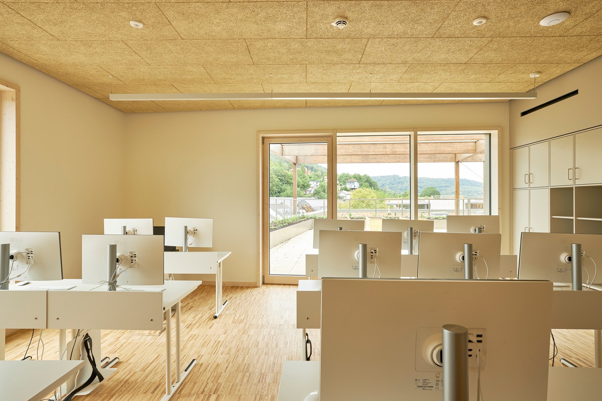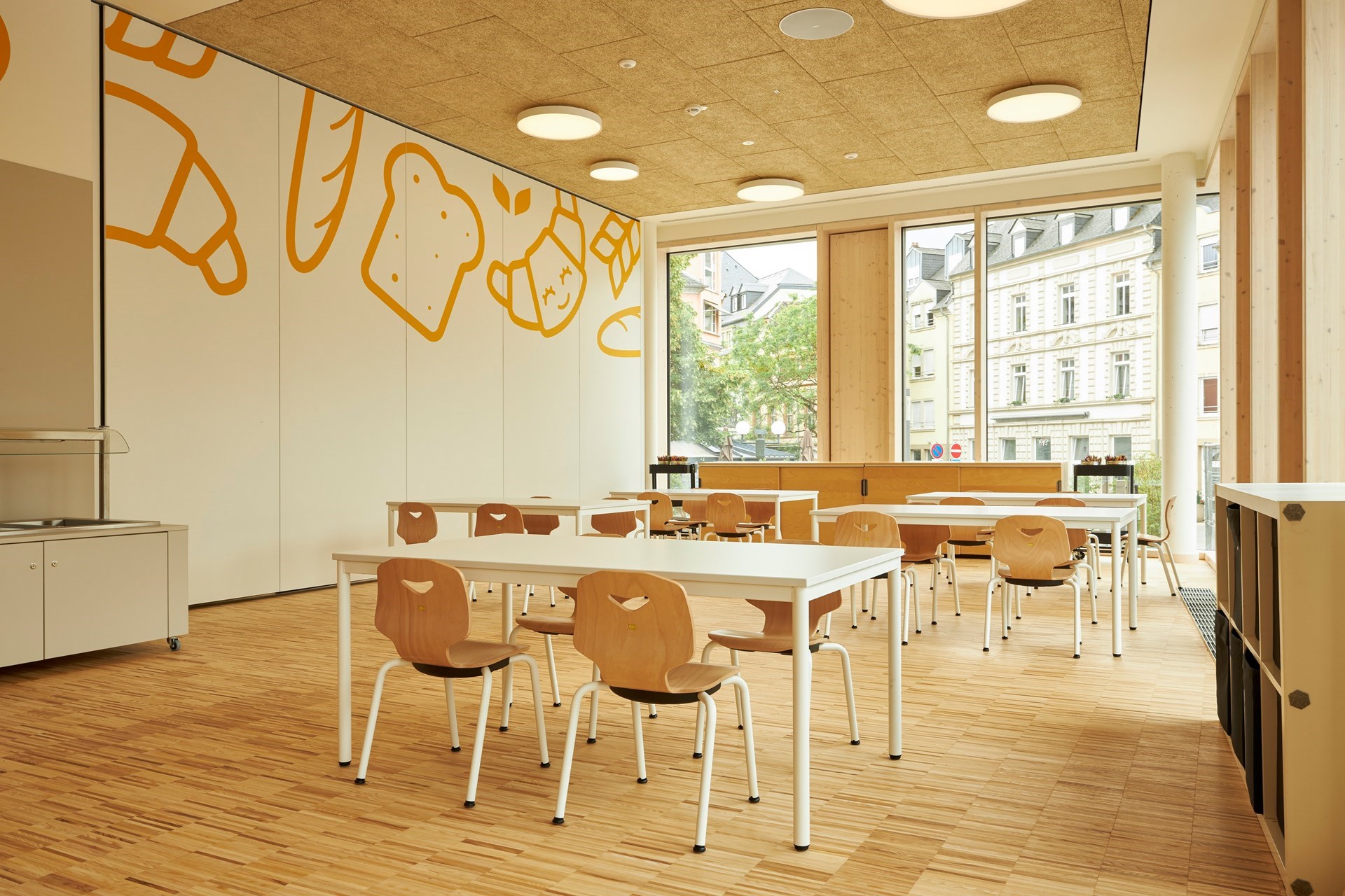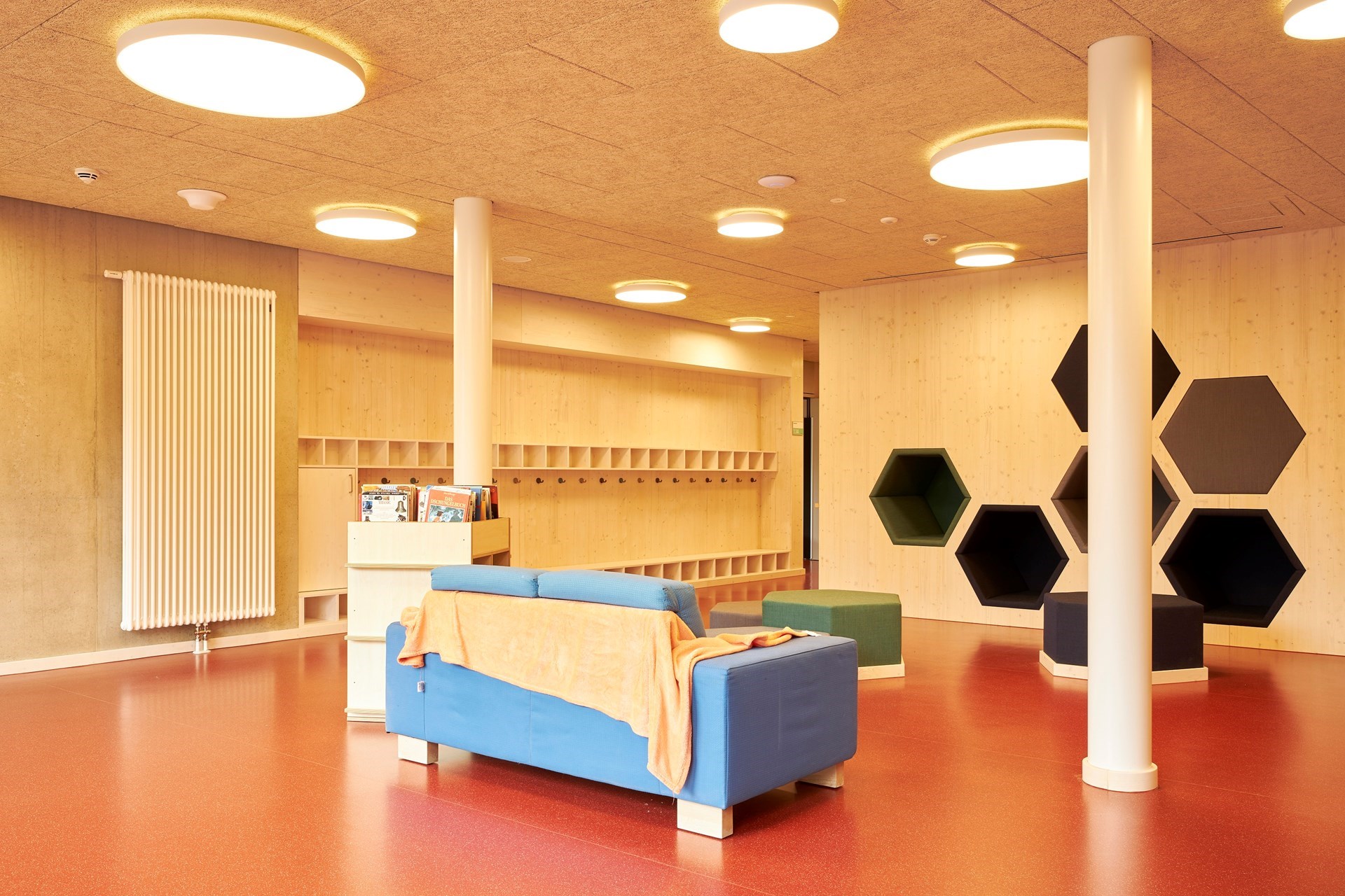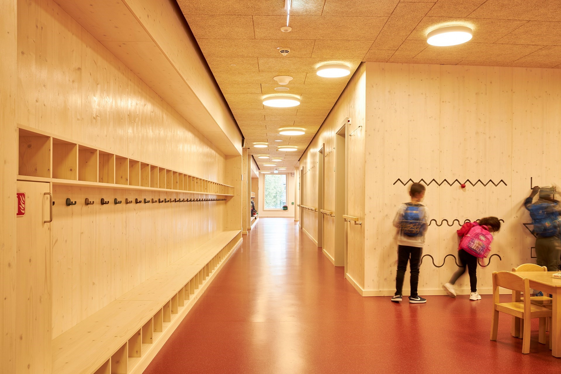 L'utilisation du bois comme matériau de construction est également un aspect important de ce projet. Non seulement le bois apporte un caractère tactile, mais il contribue également à donner un aspect frais et à petite échelle. En outre, le bâtiment répond aux exigences les plus élevées en matière d'isolation et comporte des toits verts et des jardins sur le toit. Des panneaux photovoltaïques ont également été installés pour répondre aux exigences d'une « école fraîche ».