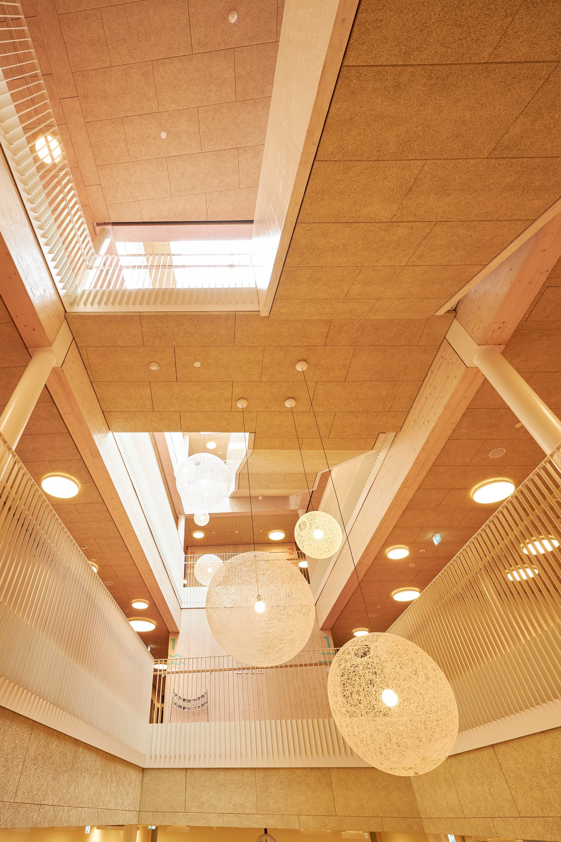 Les photos parlent d'elles-mêmes : les panneaux Troldtekt A2 en RAL 1015 sur crème et fibre ultrafine dans les versions : K5N et K5FN (montage invisible sur profilé en T, avec bords relevés) et Baffles, contribuent à l'atmosphère ouverte, à l'aspect convivial pour les enfants et à l'aspect décontracté de ce projet riche en bois.