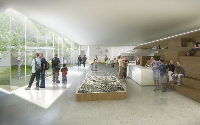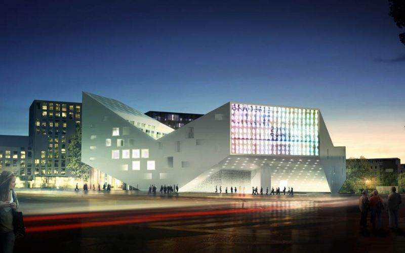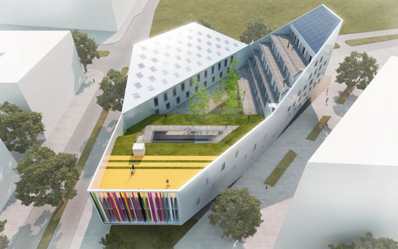 Soucieux de donner naissance à un bâtiment à la hauteur de cette ambition, la Ville de Lille et la SPL Euralille ont lancé en 2011 un concours d’architectes sur la base de ce triple programme. 115 équipes ont répondu ! C’est finalement la proposition de l’agence d’architecture Julien de Smedt qui a été retenue. Elle a dessiné une architecture triangulaire impressionnante : les 3 programmes sont répartis dans les 3 angles mais partagent des espaces communs au centre. Par le soulèvement de ses trois pointes, le bâtiment s’ouvre sur le quartier et interpelle le passant avec ses allures de vaisseau fantastique.