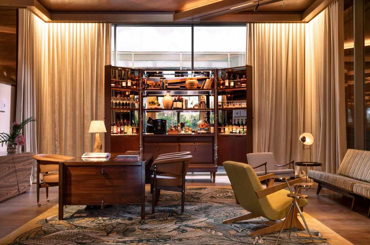 Sous la direction artistique de Philippe Starck, les intérieurs du Rosewood mettent en avant des matériaux locaux, tels que des bois exotiques, des marbres spectaculaires et des textiles typiquement brésiliens. Parmi les points forts : le lobby, un espace chaleureux agrémenté de meubles iconiques brésiliens et de bibliothèques ouvertes sur la rue ; les espaces extérieurs, des jardins luxuriants et une piscine aux influences modernistes et gaudiennes ; les restaurants, Le Jardin, ouvert 24h/24, et Blaise, une brasserie au style chalet avec des murs incrustés de pierres vertes polies. Le Rosewood abrite également une impressionnante collection d’art contemporain, avec 450 œuvres d’artistes brésiliens, comme Sandra Cinto et Vik Muniz.