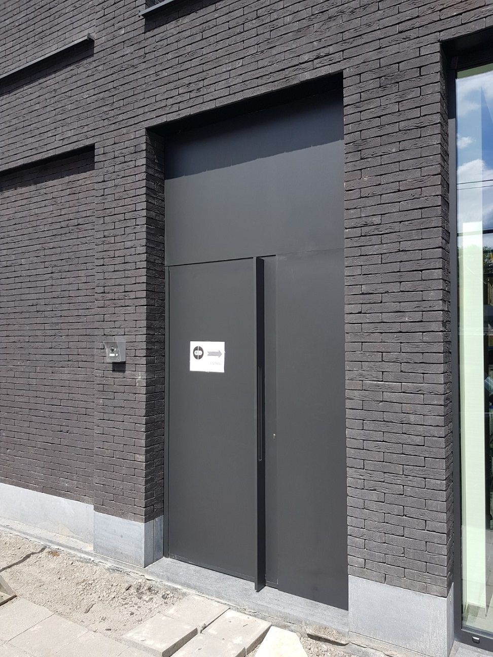 Affichant une belle unité monochrome, la nouvelle pharmacie, la maison de maître mais aussi le mur permettant d’intimiser la zone de parking intérieure sont tous de couleur noire. Thibaut Bruyr : « Le choix d’une couleur aussi sombre met en évidence les éléments d’architecture néo-classique de la façade ancienne, permettant notamment à la pierre bleue de mieux ressortir, tout en donnant une identité forte au projet. » L’œil a ainsi le champ libre pour apprécier le jeu des différents rythmes.