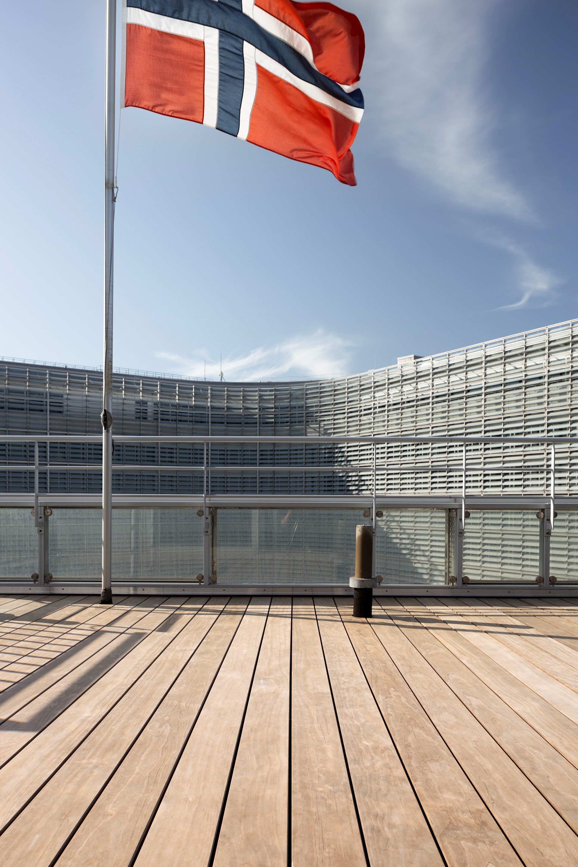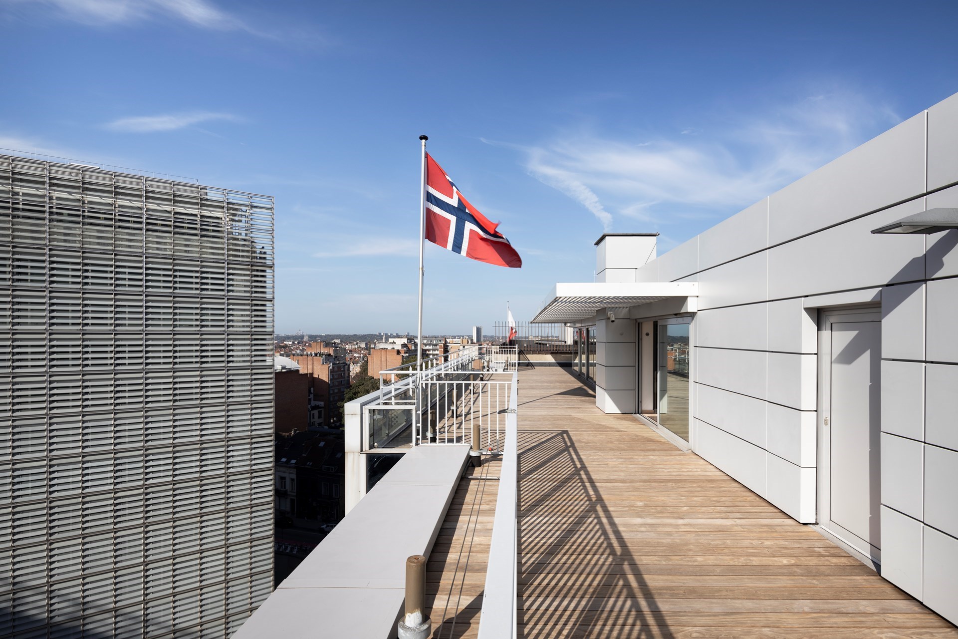 La terrasse du 10ᵉ étage de l'ambassade a bénéficié d'une transformation durable grâce aux produits en bois de haute qualité de Kebony. Ces éléments se distinguent par leur apparence sobre et leur forte résistance aux conditions météorologiques. Ce projet démontre comment l'approche innovante de Kebony dans le travail du bois - un fier héritage norvégien - contribue à l'architecture moderne.