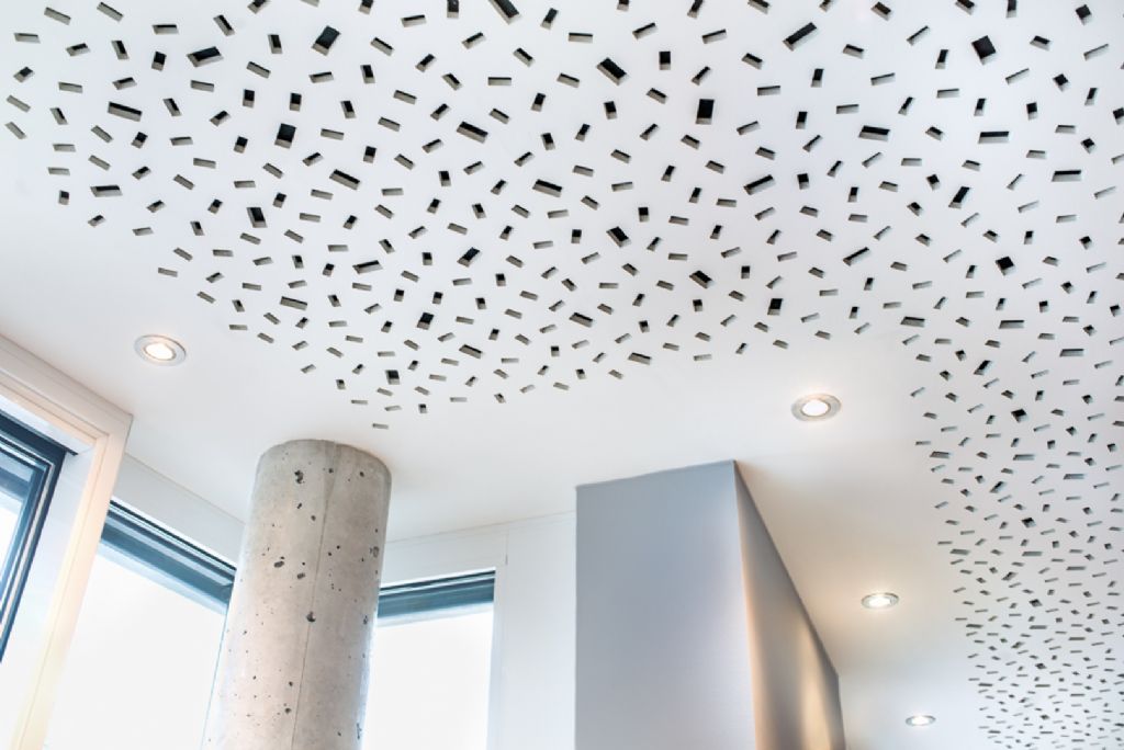 Éléments de construction majeurs, les plafonds jouent également un rôle déterminant dans la perception de l’espace. Il est donc logique que les designers y accordent une attention toute particulière et mettent leurs atouts spécifiques en valeur. En plus d’apporter une plus-value esthétique à la pièce, les plaques de plâtre perforées de Knauf n’ont pas leur pareil pour absorber les nuisances sonores. Outre ces avantages tangibles, les plaques de plâtre SoundDesign Cleaneo purifient l’air et sont on ne peut plus faciles à installer. Laissez libre cours à votre créativité avec les différents types proposés par Knauf, comme le nouveau motif Confetti aux perforations rectangulaires irrégulières.