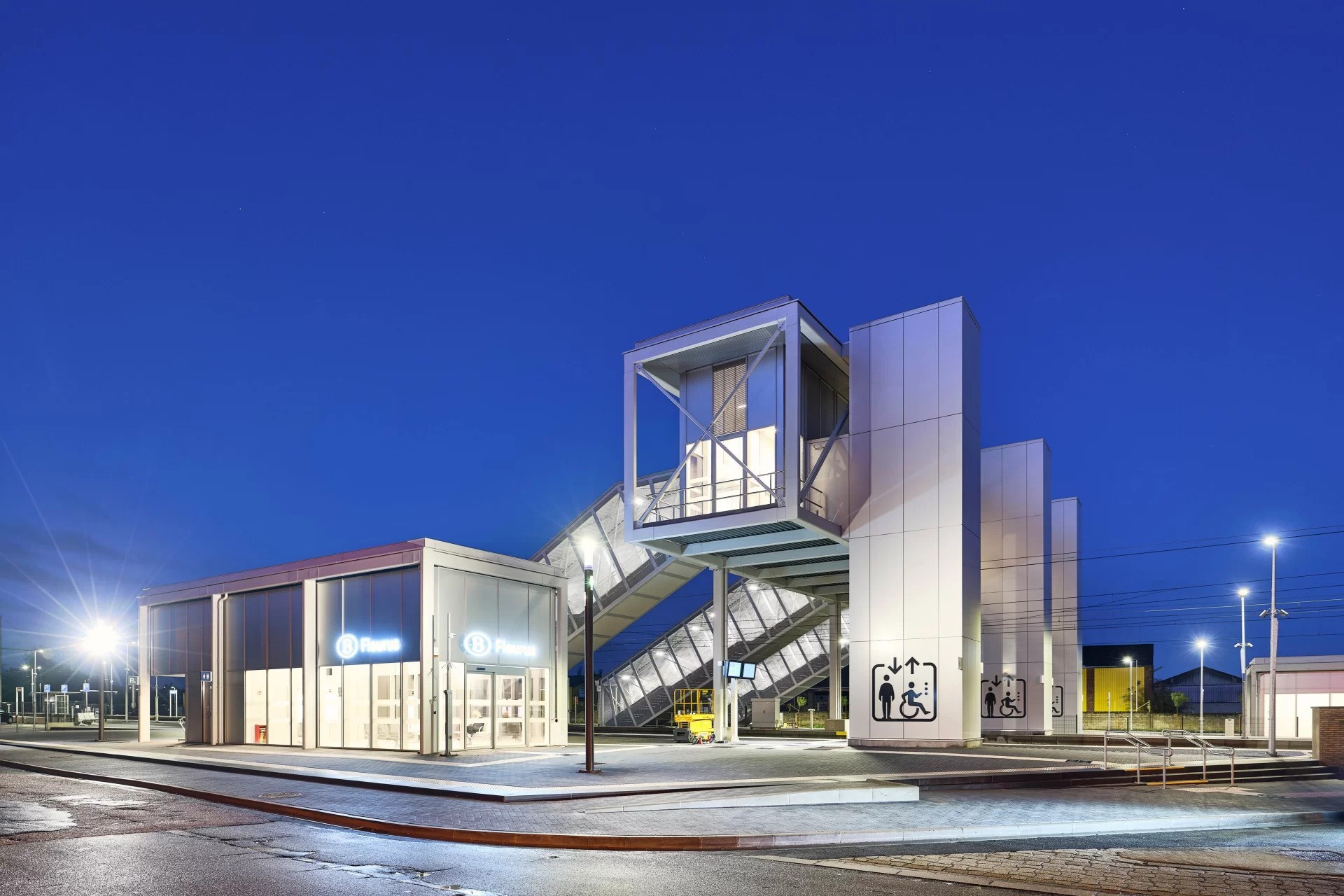 La gare de Fleurus, proche de Brussels South Charleroi Airport, a été entièrement rénovée afin de faciliter l’accès à ce dernier par transport en commun. Le chemin de fer, combiné à des navettes TEC, se voit équipé de nouvelles infrastructures mobilisant environ 170 tonnes d’acier, dont une impressionnante passerelle au-dessus des voies. Trois cages d’ascenseurs et autant d’escaliers viennent compléter le projet, ainsi que deux petits bâtiments pour les voyageurs.