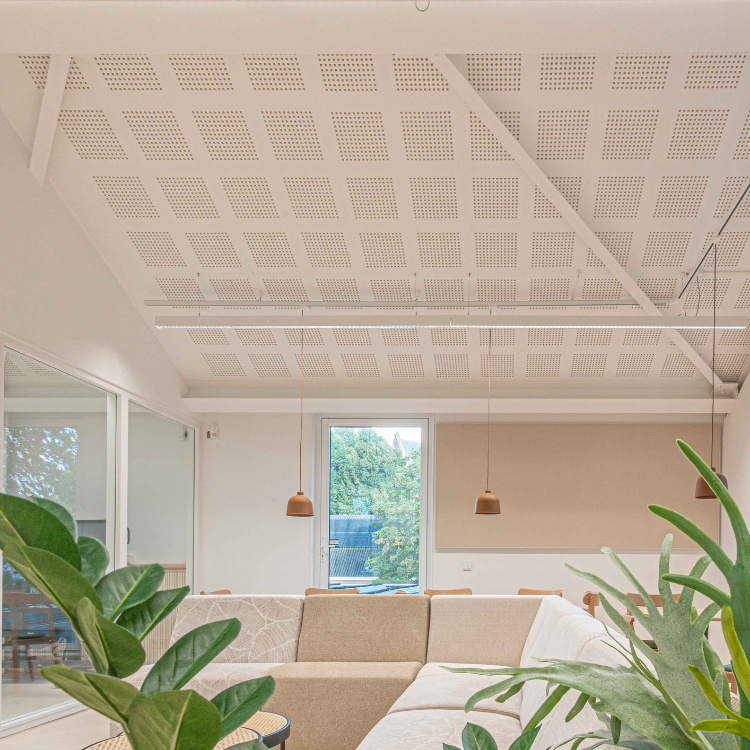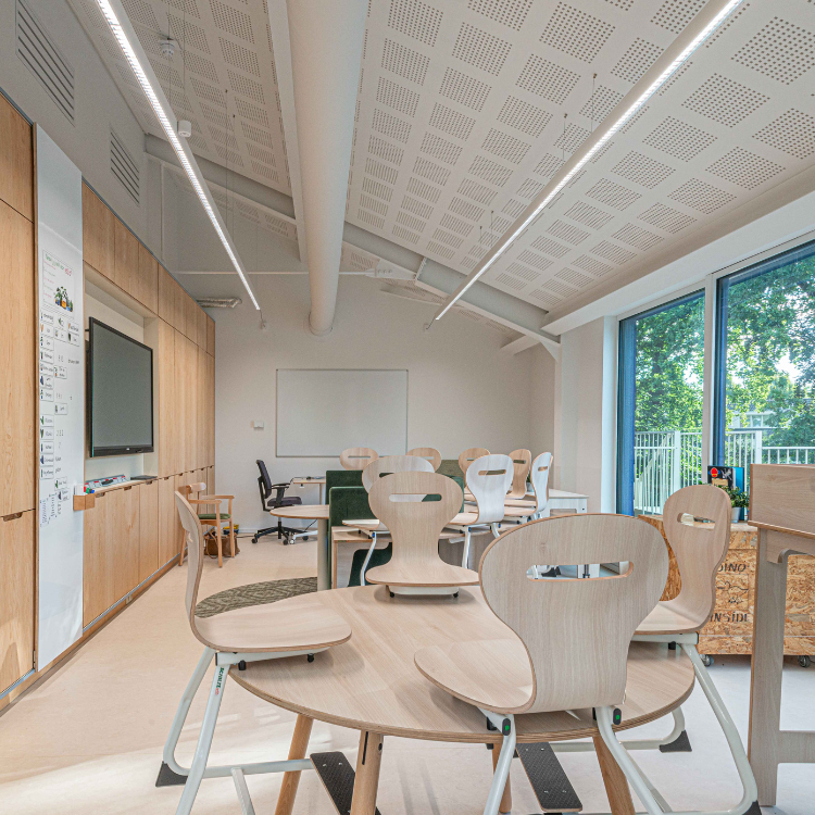 Réparti sur deux niveaux, Het Leerhuis a une superficie d'environ 1 800 m². L’élément qui attire l’attention est un vide haut et clair, avec un toit composé d’environ 600 m² de panneaux Usystem Roof DS Acoustic. Cette solution d'isolation combine six fonctions : une grande résistance structurelle, une isolation thermique en PU, une isolation en laine minérale qui absorbe le bruit, une résistance au feu de 30 minutes (REI30), une plaque supérieure en sous-toiture et une finition intérieure (perforée en plâtre) au choix. « De nombreux bâtiments scolaires optent pour un plafond suspendu avec les installations au-dessus et des panneaux de laine de verre pour l’isolation sonore. Mais nous trouvions que cela ne convenait pas ici », explique Emir. « Notre intention était de rendre les installations et l’éclairage visibles et de permettre aux utilisateurs et visiteurs du bâtiment de profiter du volume extraordinaire du vide. J’ai finalement découvert Unilin Insulation. Ce qui est génial dans ce produit, c’est qu’il combine d'excellentes propriétés ignifuges, thermiques, acoustiques et esthétiques. »