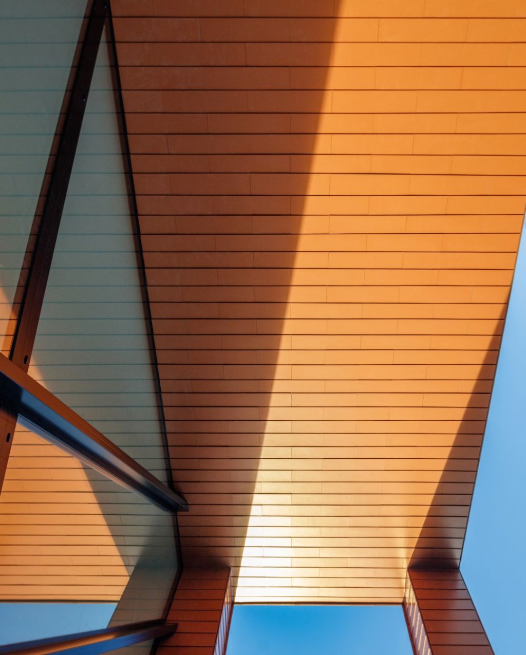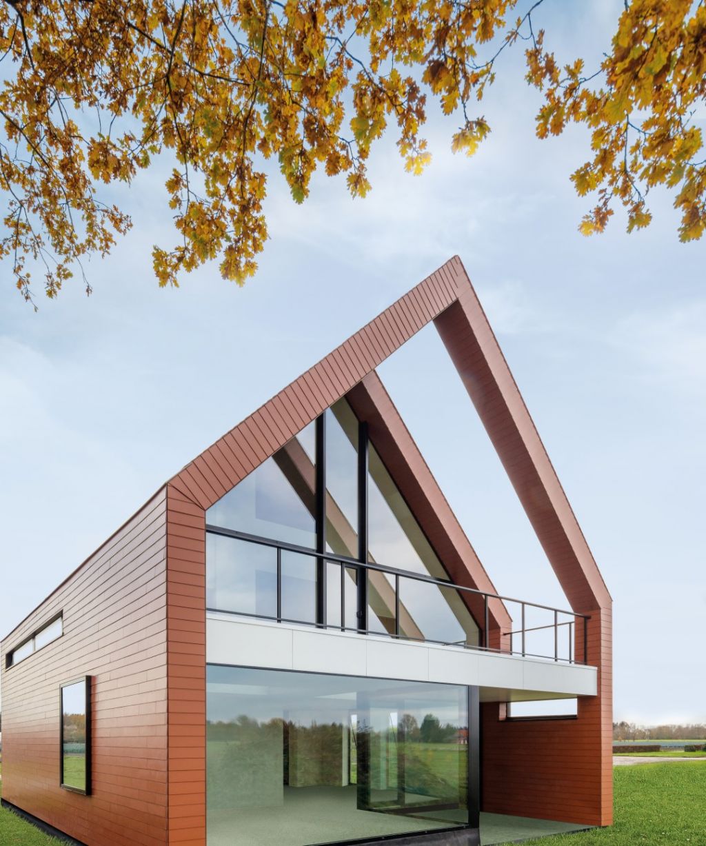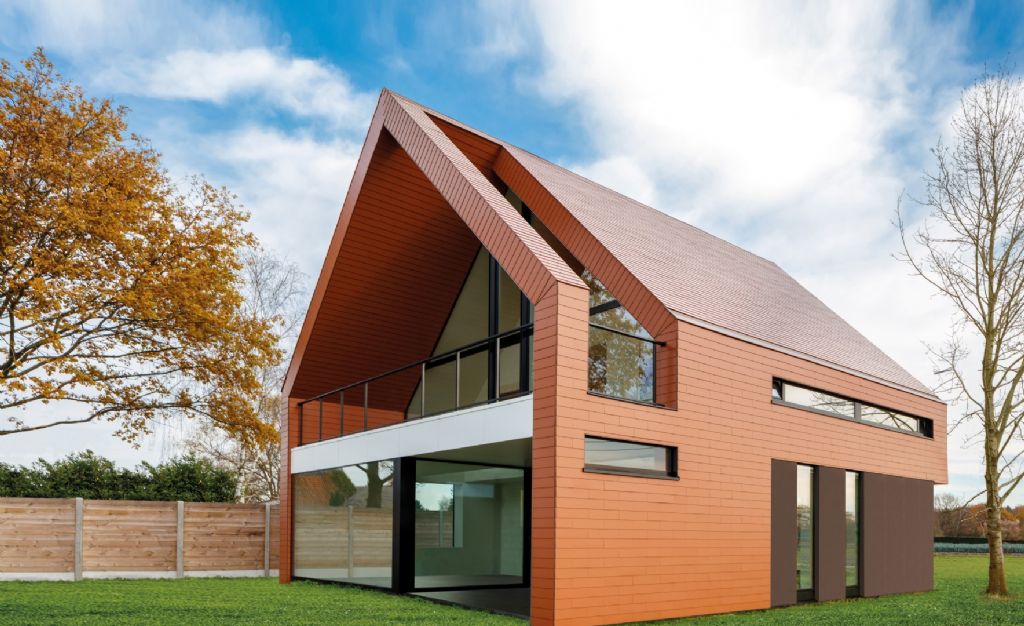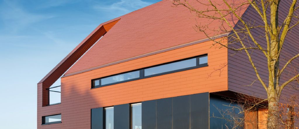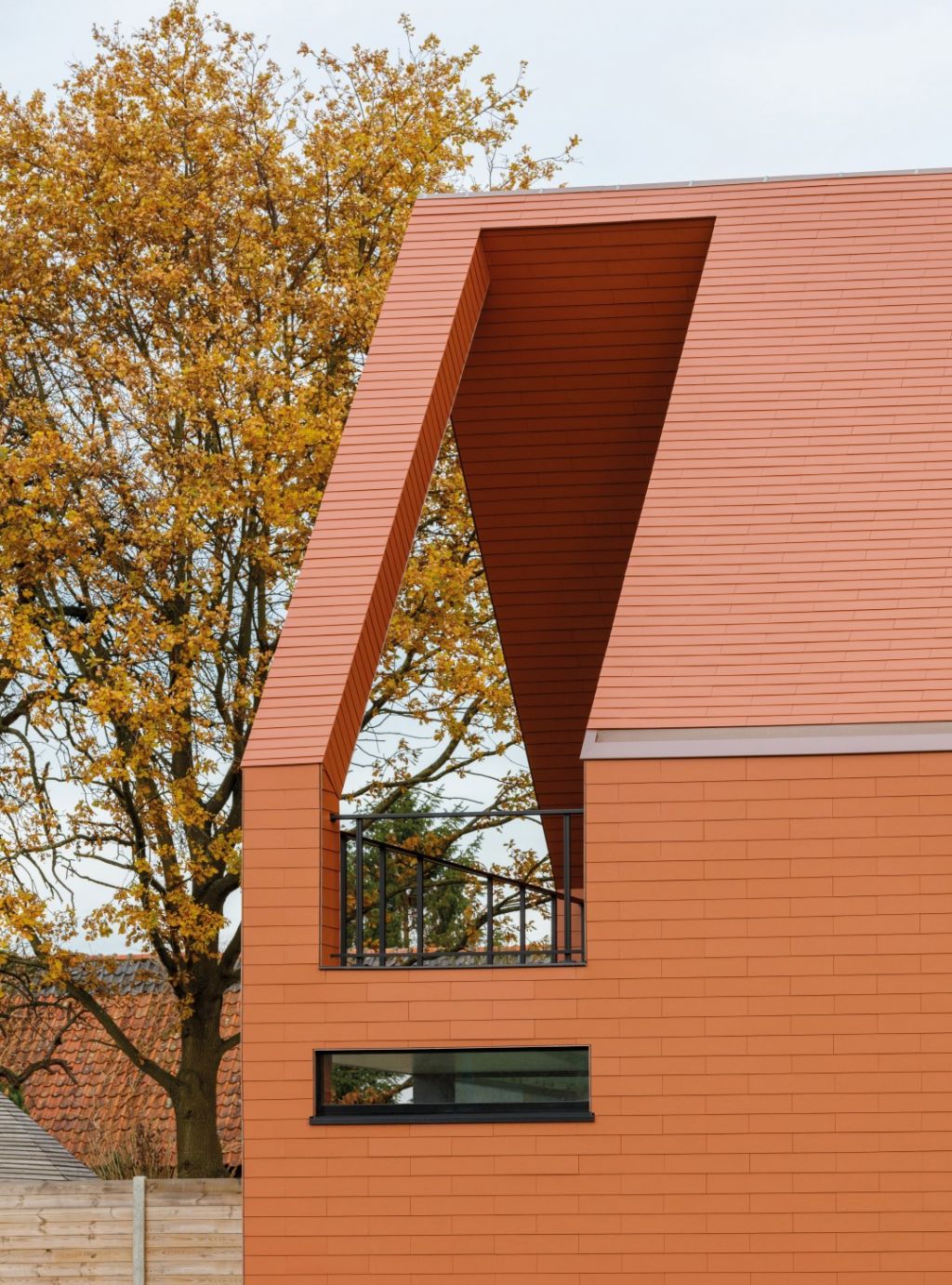 L’enveloppe du bâtiment prend de plus en plus de couleurs. Les ardoises en fibres-ciment constituent le matériau idéal pour ce faire, avec une palette de couleurs en 16 teintes. BNE Architecten a habillé sa création d’une livrée chaude avec une ardoise en fibres-ciment orange doux. Le contraste avec les châssis et panneaux noirs crée un look unique et moderne.