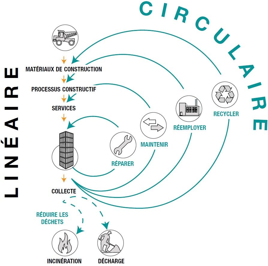 Ainsi, l’économie circulaire tend à minimiser la production de déchets par la réparation, la maintenance, le réemploi des produits et le recyclage des matériaux (voir schéma ci-contre). Cette démarche ne consiste pas uniquement à trouver des solutions techniques permettant de ‘boucler la boucle’; elle nécessite également une réflexion quant à la conception et à la manière dont sont assemblés les éléments construits dont on souhaite prolonger et optimiser la durée de vie. En parallèle, de nouveaux modèles économiques sont développés afin de supporter ces approches.