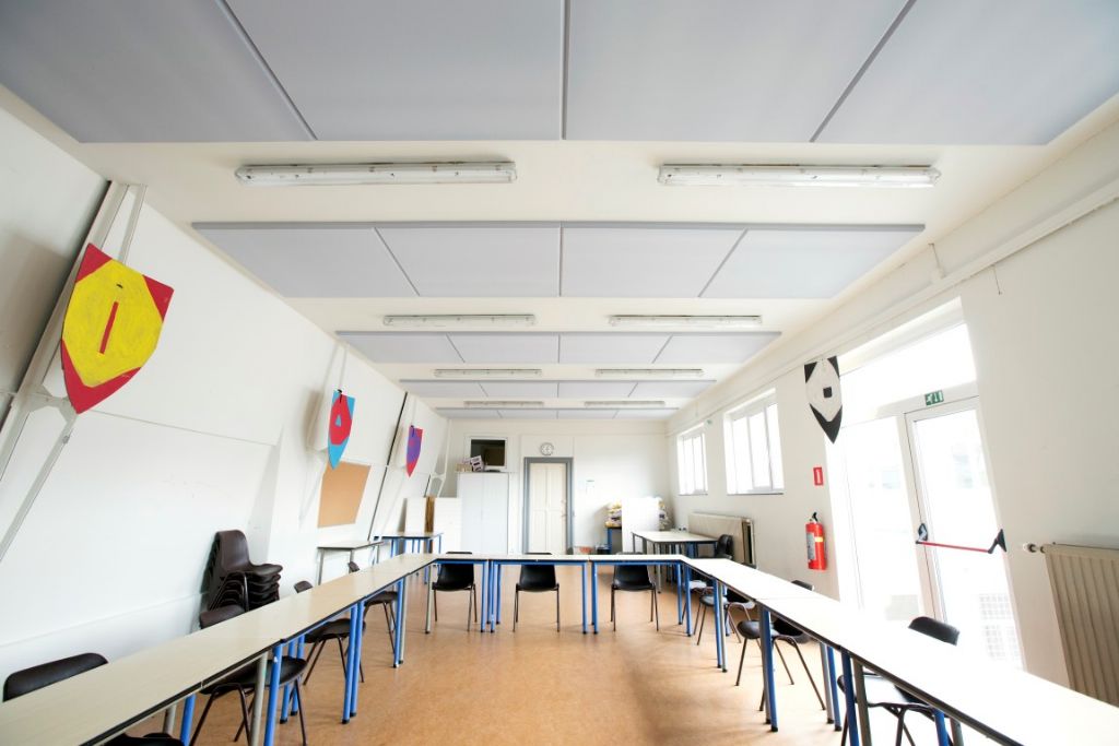 De par la hauteur de plafond dans 7 salles de classe, il était possible d’utiliser des îlots de plafond suspendus. Ceux-ci ont l'avantage qu'ils peuvent être adaptés aux perspectives spatiales individuelles. Pour des raisons budgétaires, on avait choisi préalablement pour les îlots de plafond BALANCE en mousse de mélamine, et non pas pour les panneaux recouverts de tissu. Avec ses formats flexibles, une efficacité acoustique élevée (même à faible hauteur de montage) et un design intemporel, cet îlot de plafond s’intègre parfaitement dans tous les intérieurs. Dans ce cas précis, on a suspendu 36 îlots plafond du type BALANCE COLOR de 2000 x 1250 x 20 mm (couleur: RAL 7035), répartis sur les 7 locaux ayant une hauteur de plafond de 4 m, suspendus à des câbles de 1 m.