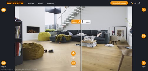 L’Interior Designer de MEISTER est un outil précieux pour visualiser les sols dans son propre intérieur ! De nombreux clients ne sont pas sûrs du rendu qu’aura un sol dans une pièce. Vaut-il mieux une teinte sombre ou une couleur claire ? Et qu’en est-il du format : lames longues ou carreaux plus courts ? Et comment le sol se marie-t-il avec mon canapé ? L’Interior Designer permet de répondre facilement à toutes ces questions. Téléchargez simplement une photo de la pièce, choisissez le sol et voilà !