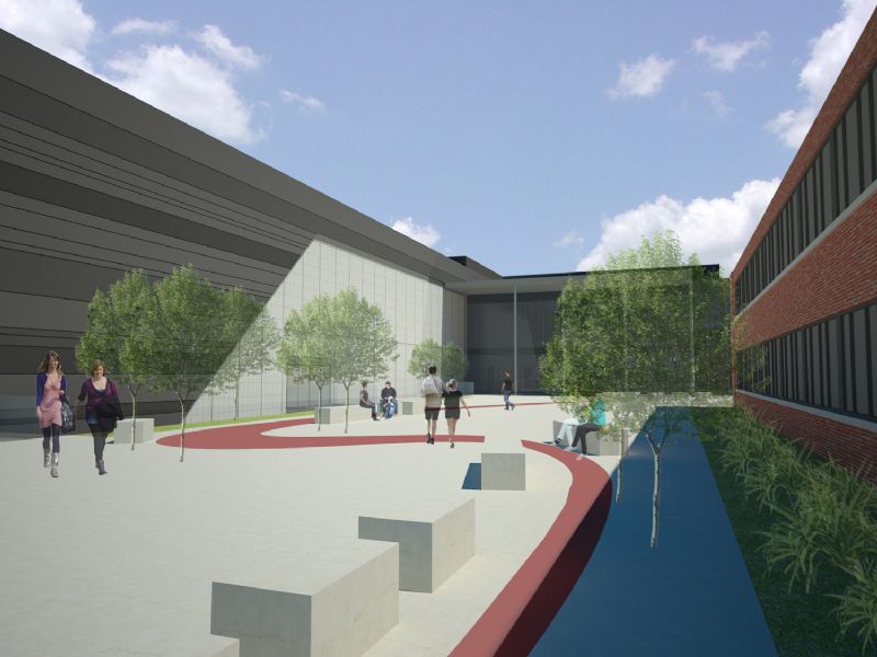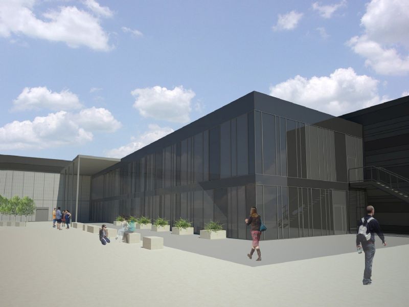 La place centrale située entre l'actuel théâtre Brel et le complexe à construire est le centre du site, qui donne accès au nouveau bâtiment. Le projet est conçu de telle manière que le découpage logique ne sert pas seulement la fonctionnalité du nouveau complexe mais également le site scolaire tout entier (8,3 hectares). Grâce à de grands panneaux Kalwall pour les façades, il est possible de faire profiter l'ensemble des équipements sportifs d'un maximum de lumière naturelle.