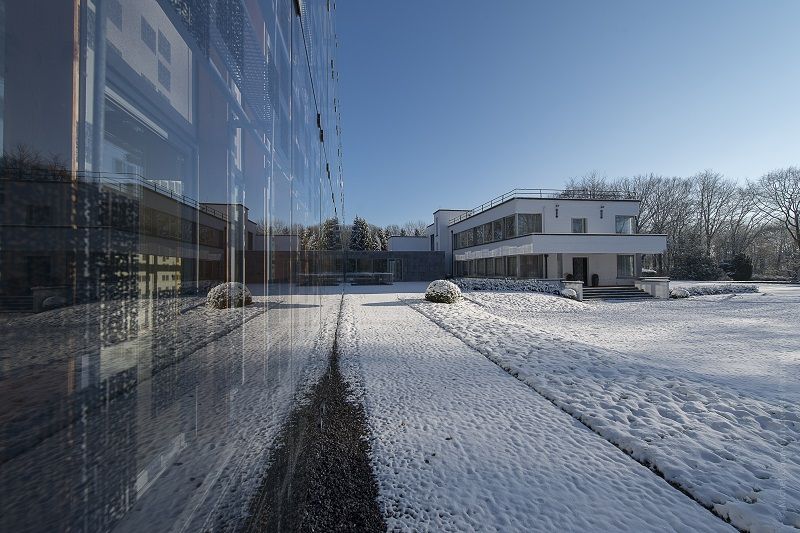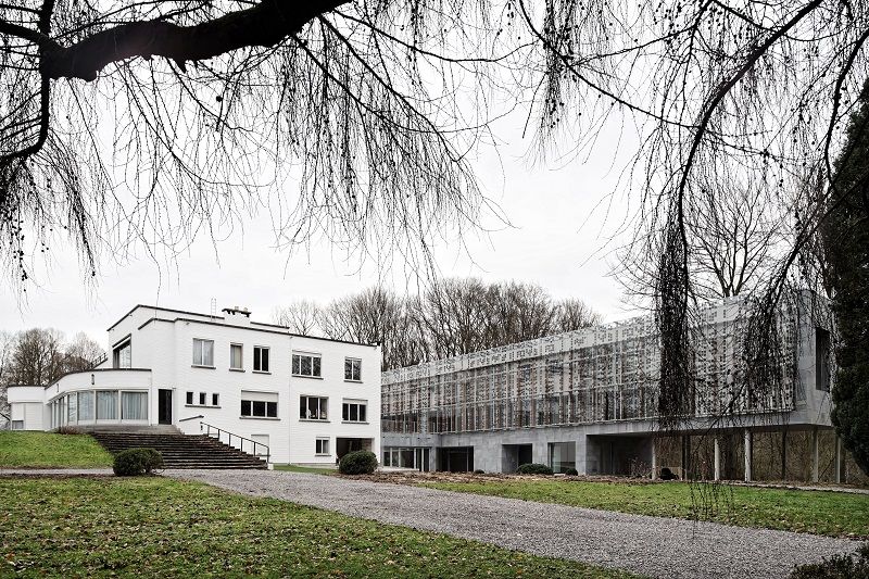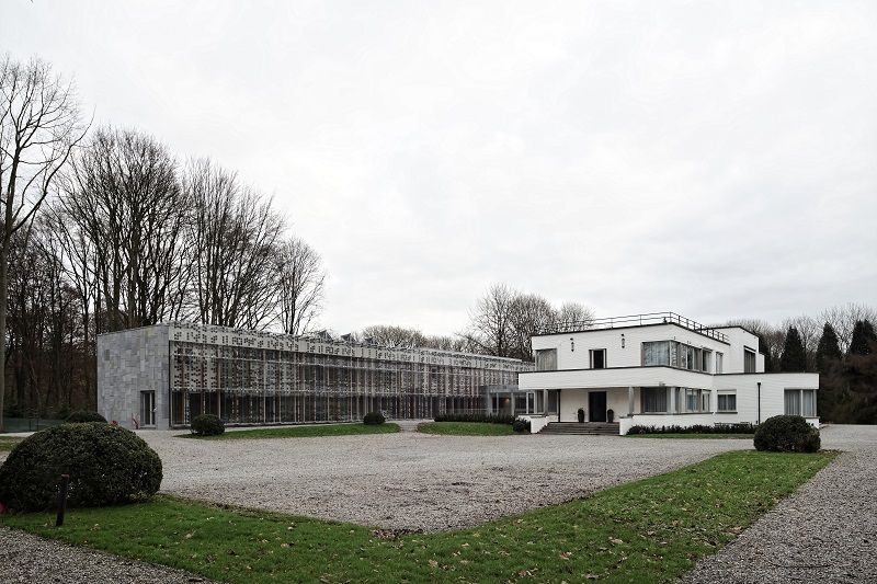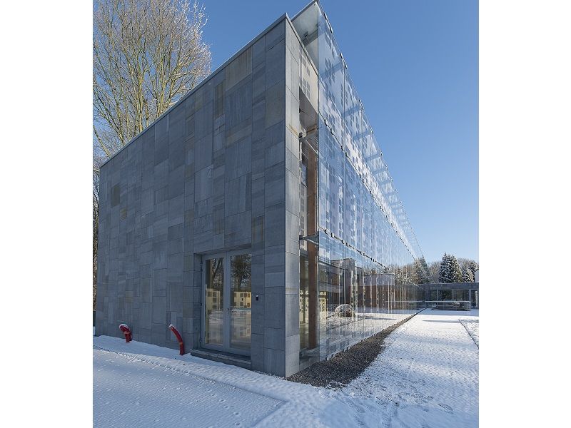 La nouvelle Aile de Launoit, conforte la vocation de ce lieu mythique à être un écrin pour l’excellence artistique musicale au milieu de la nature. Tel le monolithe de « 2001 L’Odyssée de l’espace » (Stanley Kubrick 1968), le projet se traduit par une longue barre de près de cent mètres de long, tendue à l’arrière du bâtiment construit en 1939 par Yvan Renchon. Comme une toile de fond pour ce patrimoine classé dont elle double les capacités, la nouvelle architecture joue avec le verre et la pierre bleue des Carrières du Hainaut pour créer un décor qui reflète la nature autant qu’il répond à l’architecture existante.