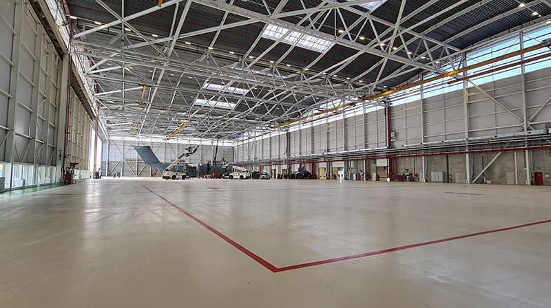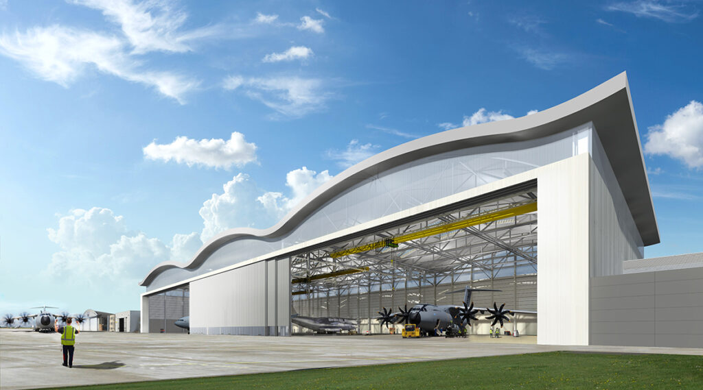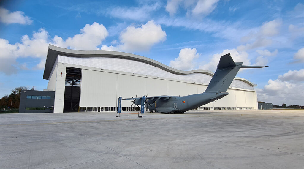 Le hangar géant peut accueillir trois A400M en même temps. Étant donné la taille de ces avions, le bâtiment est conçu de telle sorte qu’il n’y a pas de piliers dans le hangar pour soutenir le toit. Le toit ondulé est ainsi entièrement soutenu par les murs extérieurs. Pour faciliter l’entrée et la sortie des avions, des portes d’une largeur de 68 mètres et d’une hauteur de 18,5 mètres ont été installées. Outre le hangar, il y a également deux étages de bureaux, une zone logistique et des zones de stockage et d’atelier.
