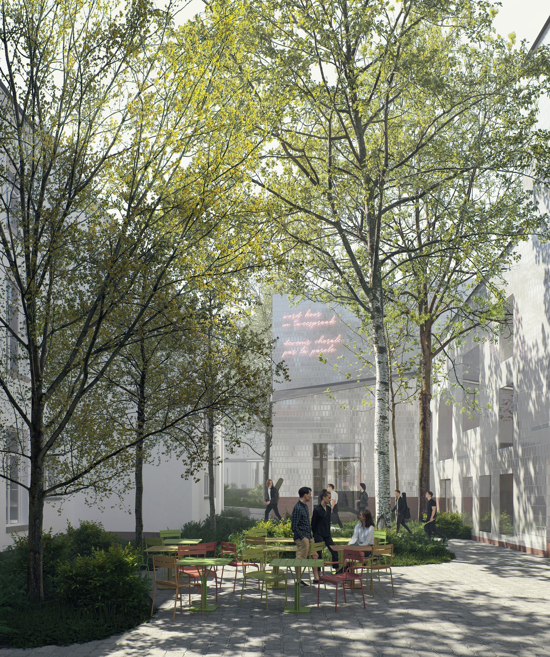 Les zones non construites seront conçues comme six jardins, des oasis de paix et de lumière qui augmentent la biodiversité et permettent l'infiltration naturelle des eaux de pluie. La cour d'honneur à l'entrée sera préservée. La salle de lecture de la nouvelle bibliothèque donnera sur un jardin d'hiver inspiré du 19e siècle. De là, un jardin vertical conduira par des escaliers au jardin intérieur avec cafétéria et terrasse. Enfin, un patio sera créé à côté du foyer de la salle de concert historique.