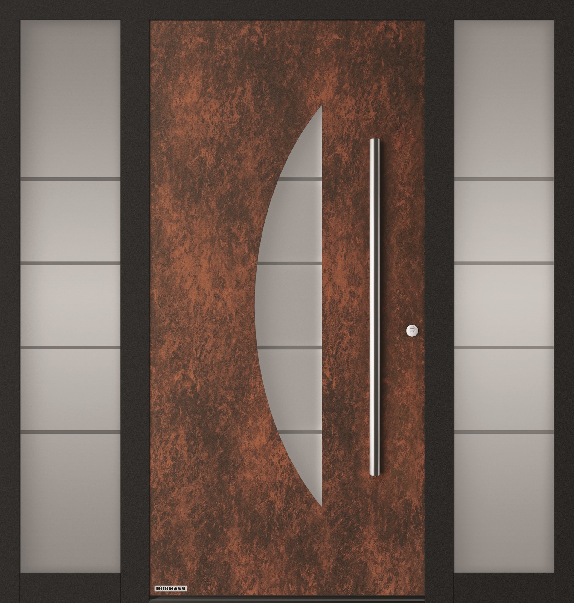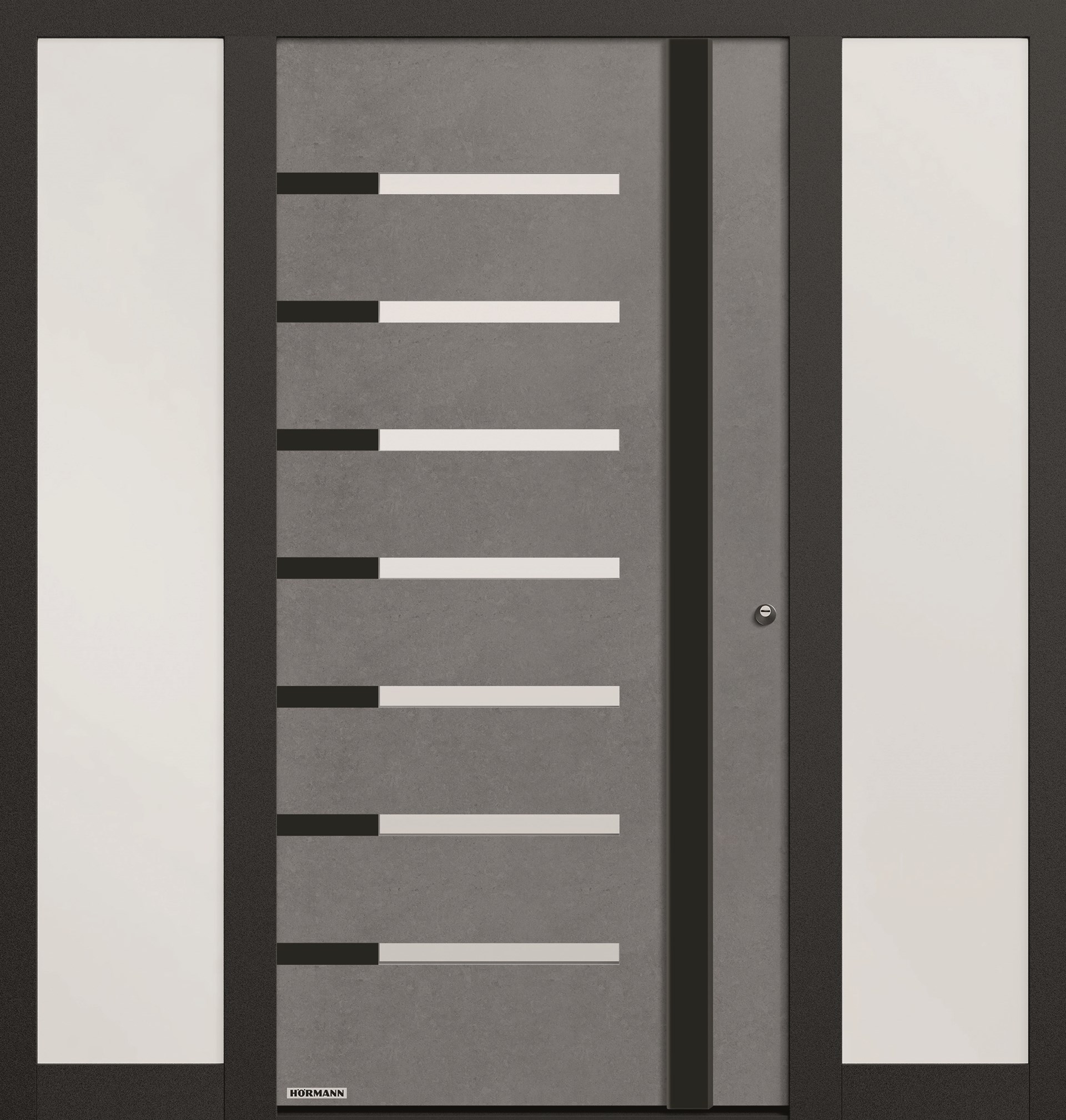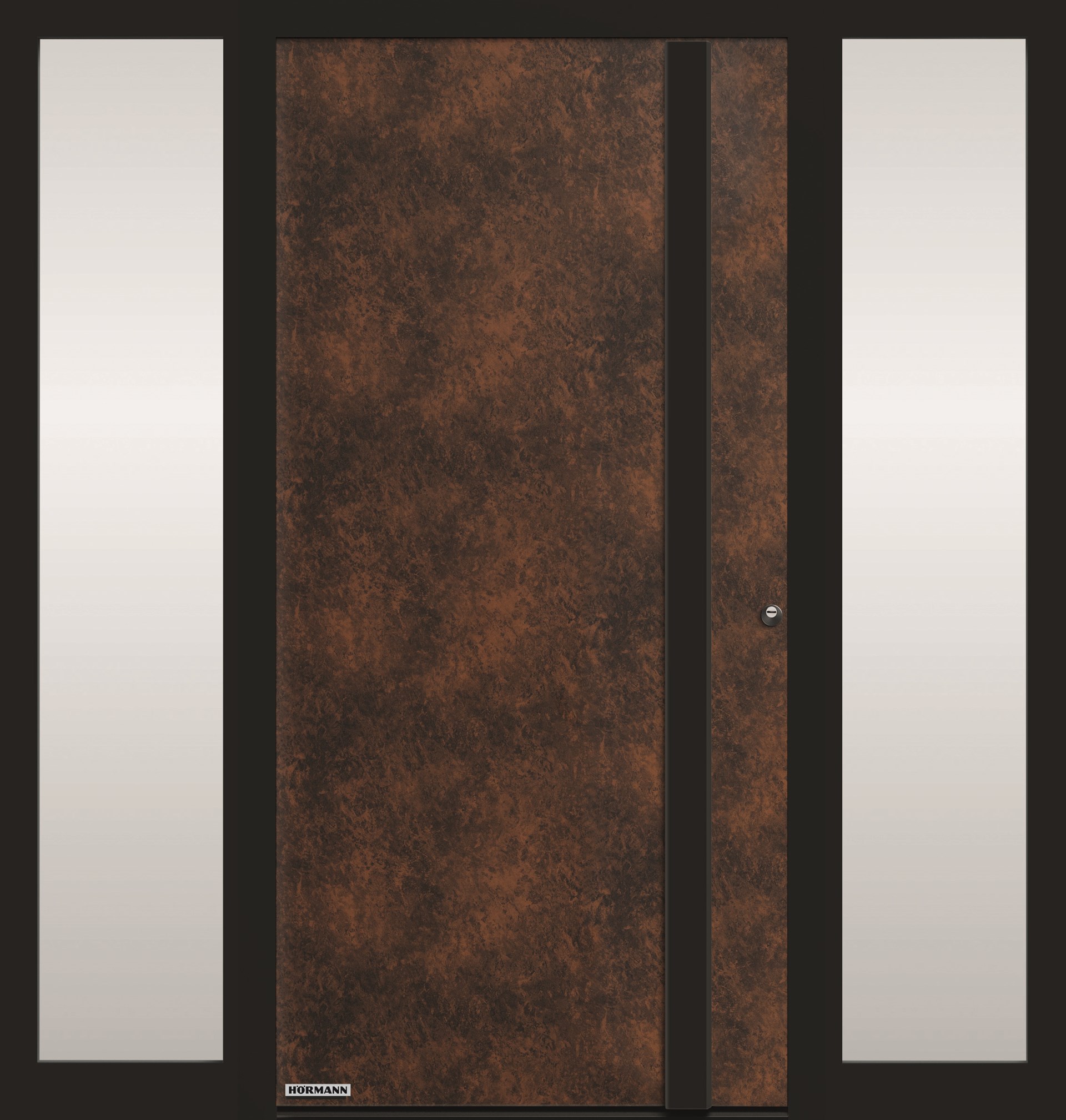 Les différentes finitions sont appliquées sur la surface de la porte en aluminium thermo-laqué à l'aide d'un procédé de revêtement breveté. Le profilé standard du cadre et les poignées extérieures en acier inoxydable disponibles en option, tous deux en noir profond, confèrent une élégance particulière et un aspect industriel moderne.