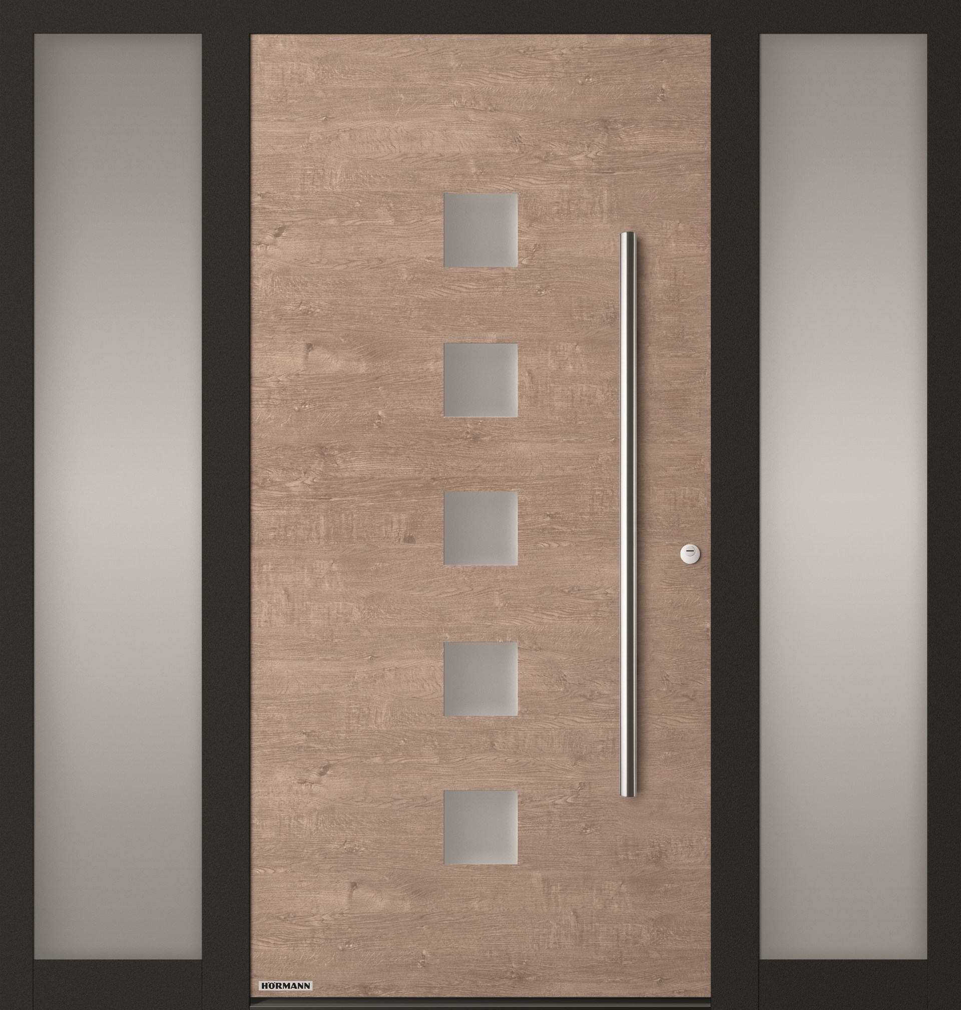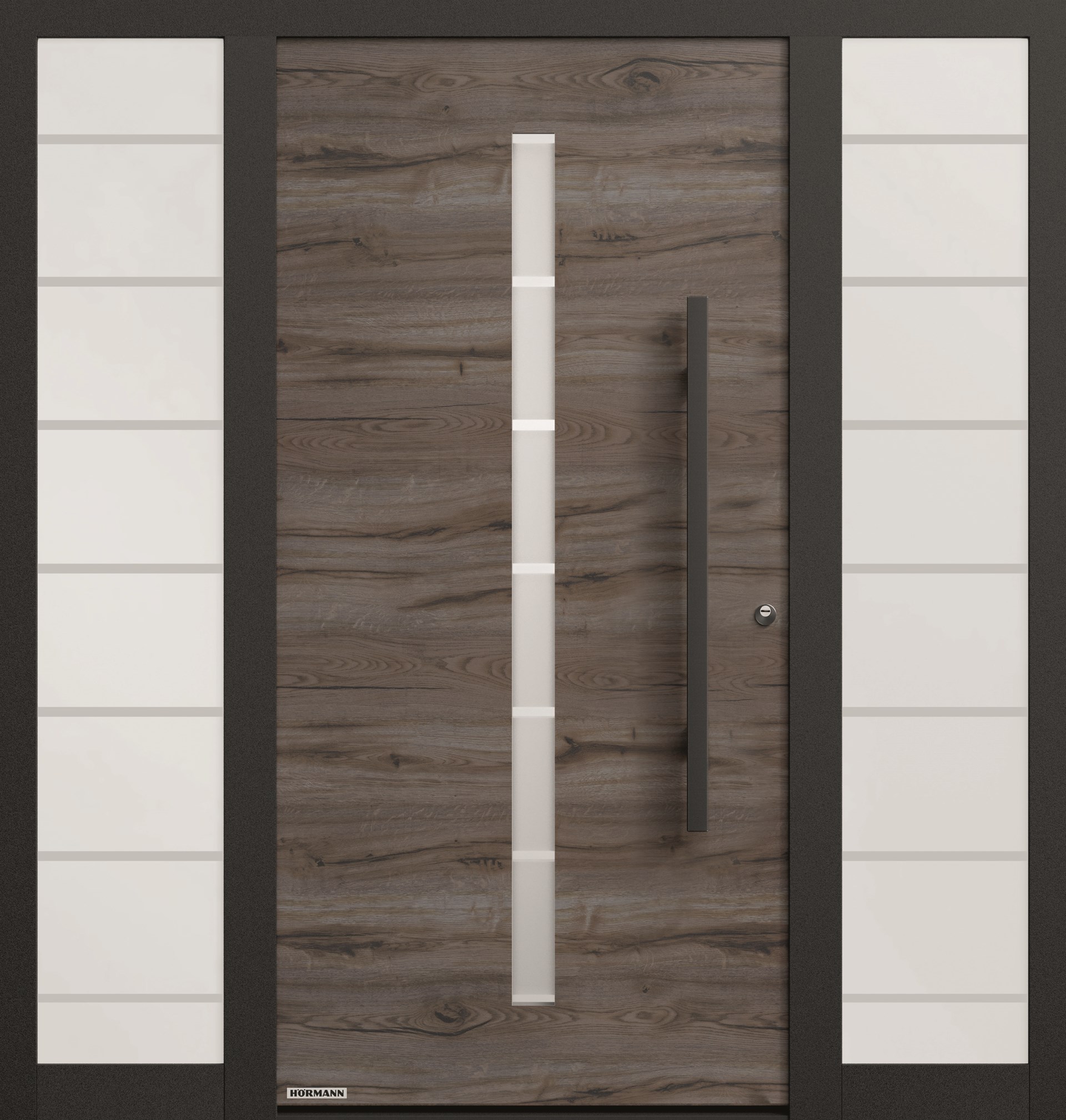 Pour les plus exigeants en matière de design pour leur porte d'entrée en aluminium, Hörmann est fier de présenter ThermoSafe Decoral. Cette nouvelle gamme de couleurs se compose de cinq décors qui peuvent être utilisés sur dix-huit types exclusifs de portes ThermoSafe, avec ou sans vitrage. Le choix comprend Patine de rouille, Bois de grange gris, Chêne sauvage, Ciment et Bois de grange. Pour ceux qui aiment un style chaleureux et traditionnel, le Bois de grange (gris) est une option. Vous préférez un look un peu plus sobre ? Alors le Ciment est la solution. Chaque couleur donne à la porte d'entrée et à la maison le caractère qu'elles méritent.