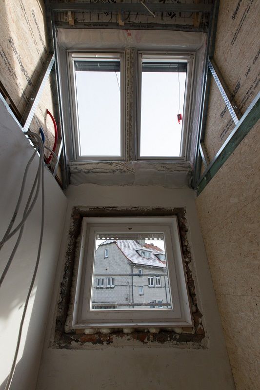 Le grenier auparavant sombre et inhabité a été transformé en une chambre spacieuse et lumineuse grâce à l’installation de deux grandes fenêtres de toit VELUX : une fenêtre de toit électrique INTEGRA côté rue, et une fenêtre de toit à projection manuelle côté jardin. Deux nouvelles fenêtres de toit électriques INTEGRA au-dessus de l’escalier garantissent par ailleurs un véritable puits de lumière au cœur de la maison.