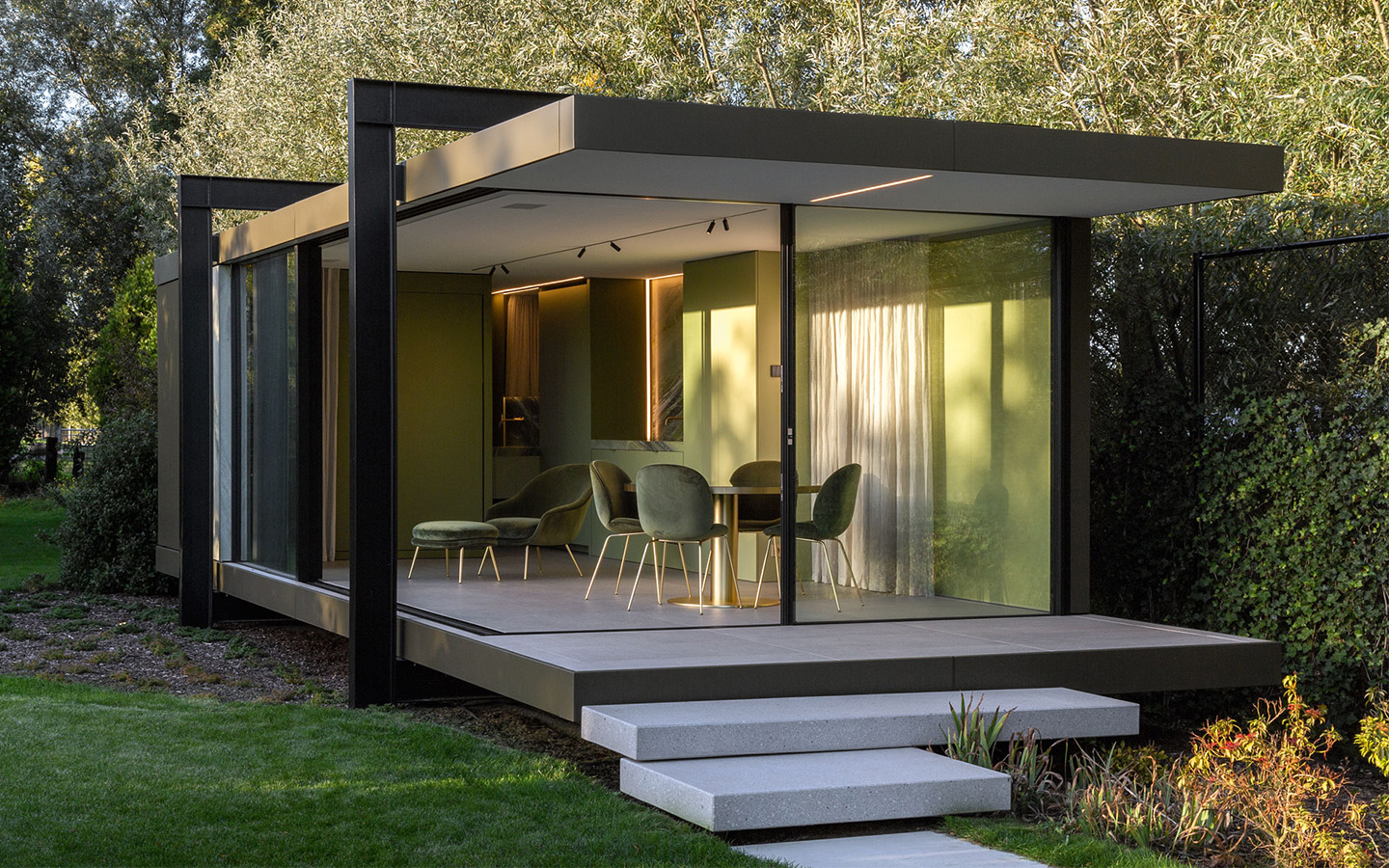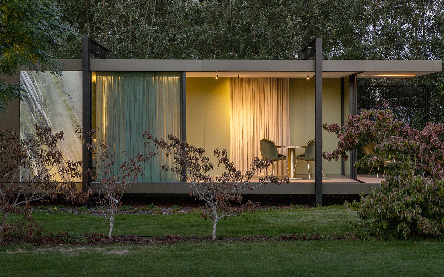 Vilarte offre un pavillon esthétique et intemporel qui estompe les frontières entre l'intérieur et l'extérieur. De plus, ils sont très adaptables. Les pavillons sont basés sur un cadre fixe mais flexible qui sert de base principale. Tout le reste est adapté aux souhaits et aux besoins personnels du résident. Cela va de l'usage proprement dit - espace de bureau, atelier d'art ou espace de bien-être privé - à l'agencement du pavillon, en passant par le type de marbre, les finitions et les équipements de haute qualité. Cette approche permet à Vilarte de concevoir des abris luxueux et uniques en leur genre dans un délai de production très court.