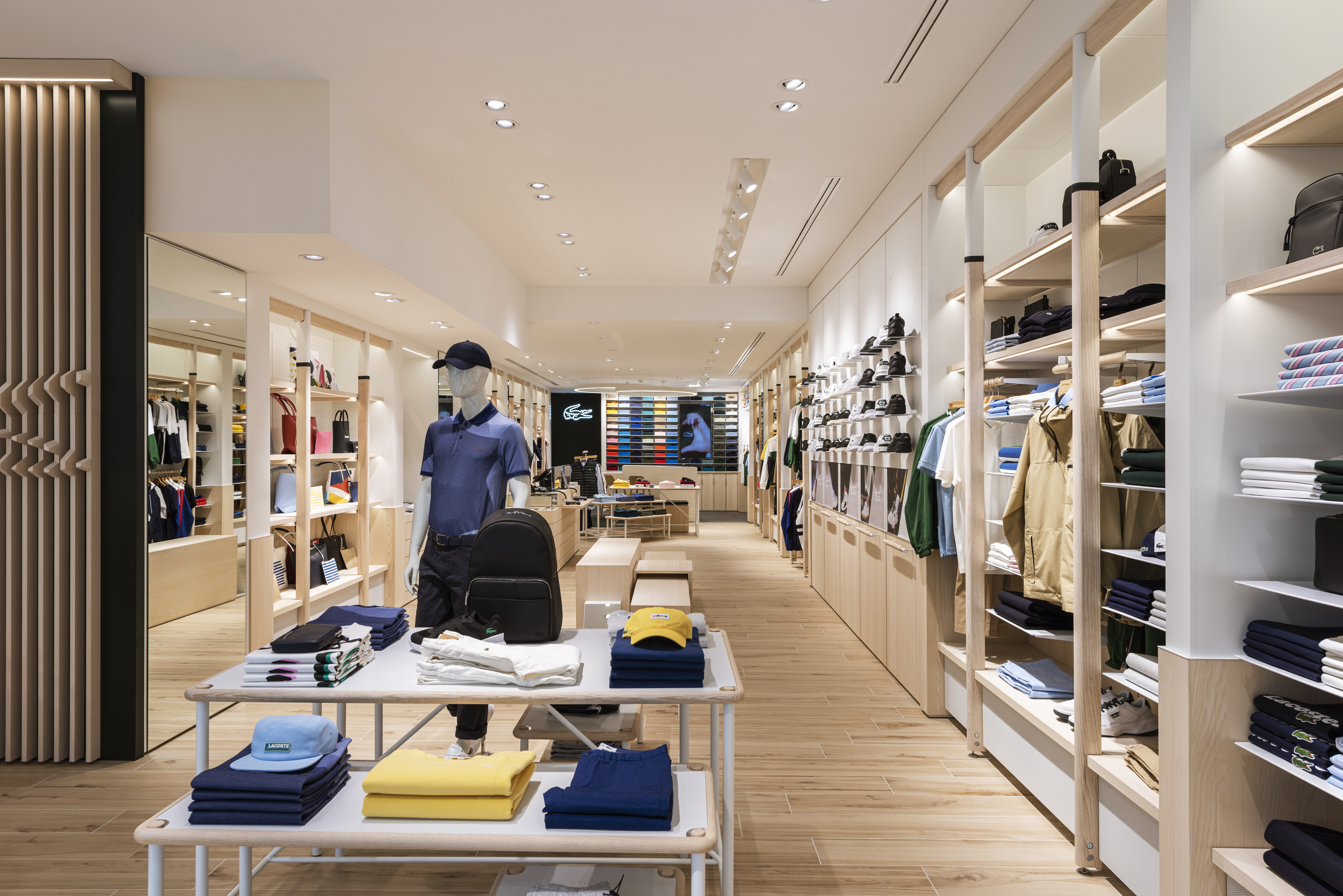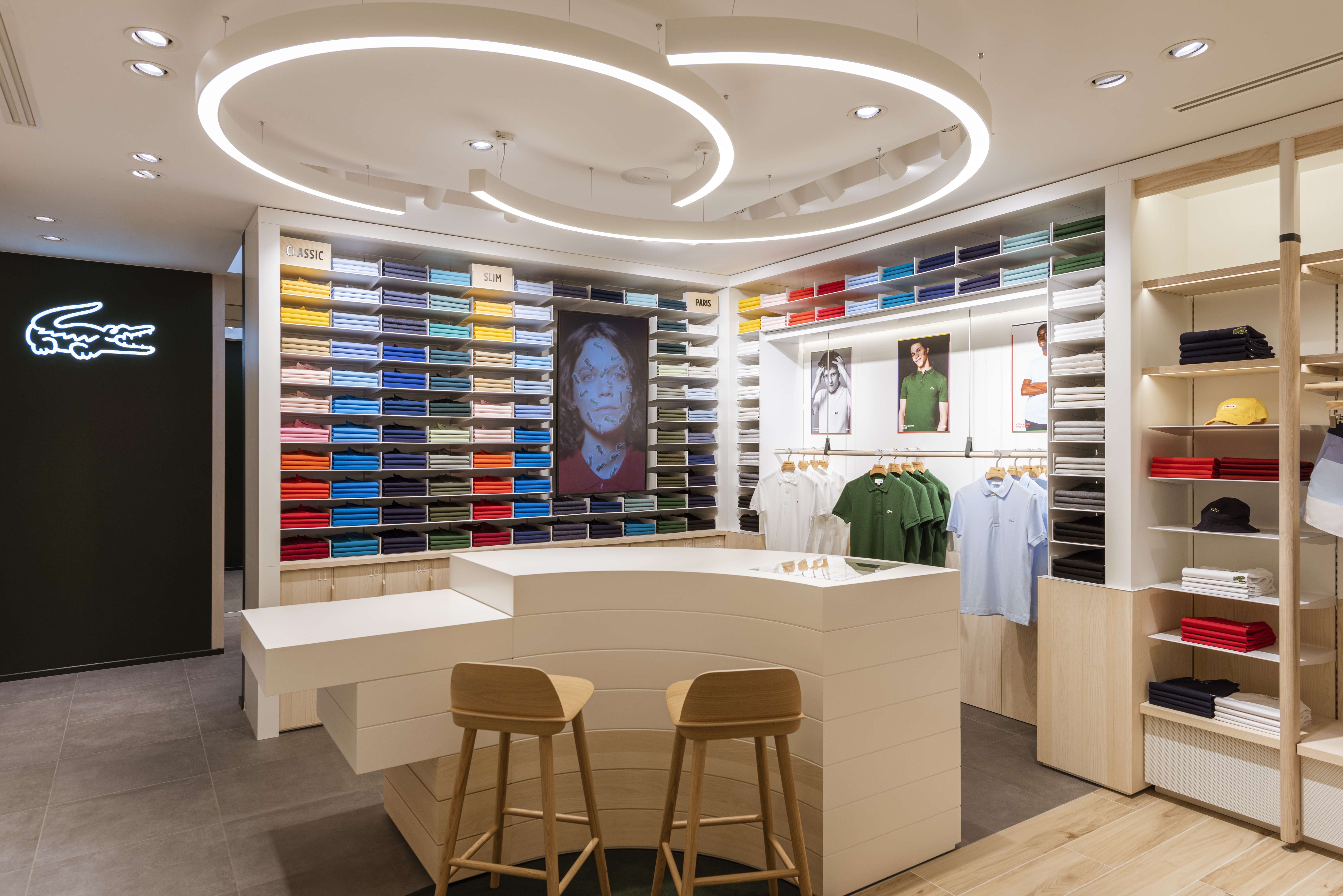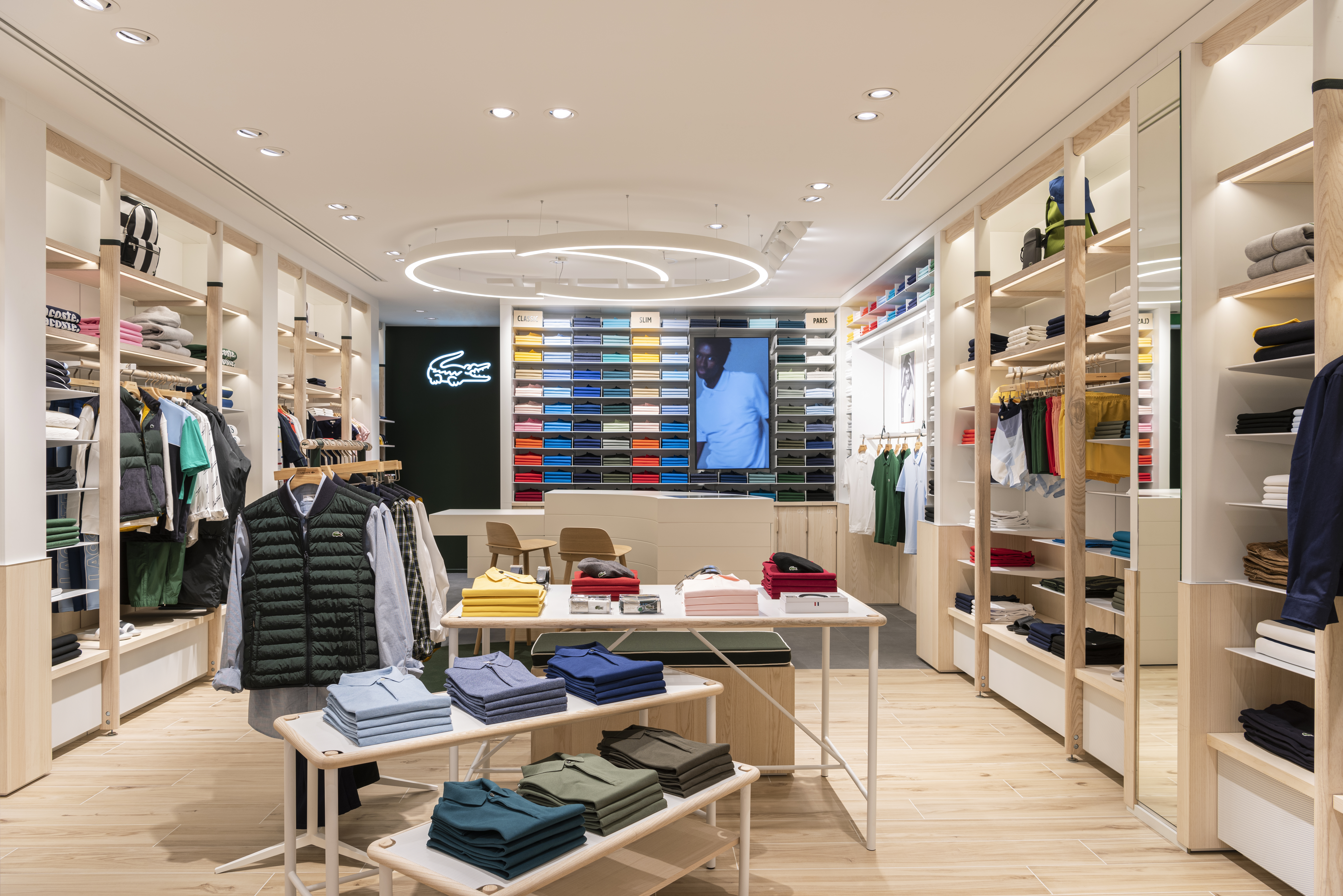 A l'intérieur, le visiteur a immédiatement l’œil attiré par le mur de polos, des étagères remplies à ras bord du vêtement le plus emblématique de Lacoste dans toutes les tailles, couleurs et coupes. Avec une superficie d'environ 150 m², le nouveau magasin abrite les différentes lignes de produits de la maison de couture française. On y trouvera notamment la célèbre collection Runway, dessinée par Louise Trotter.