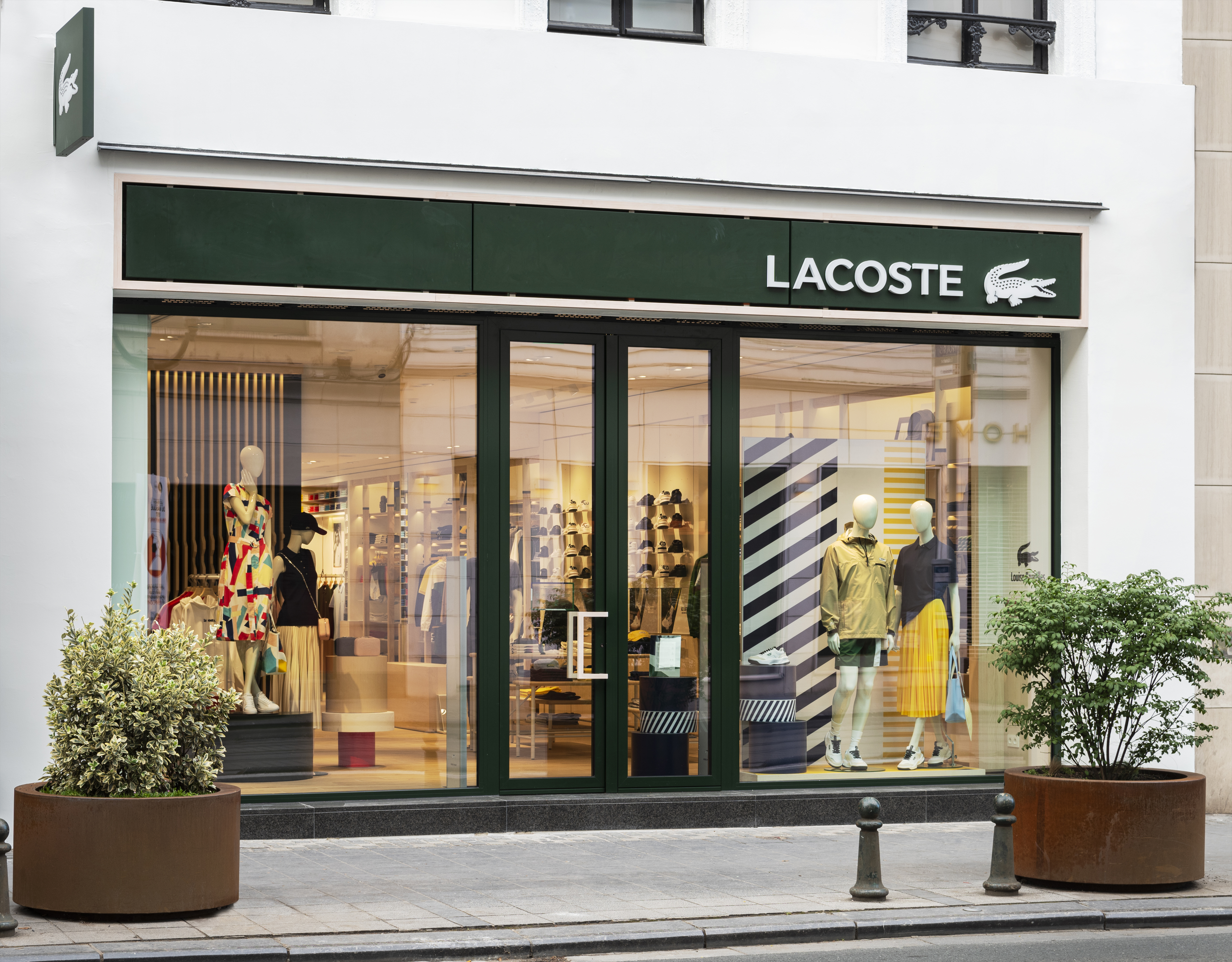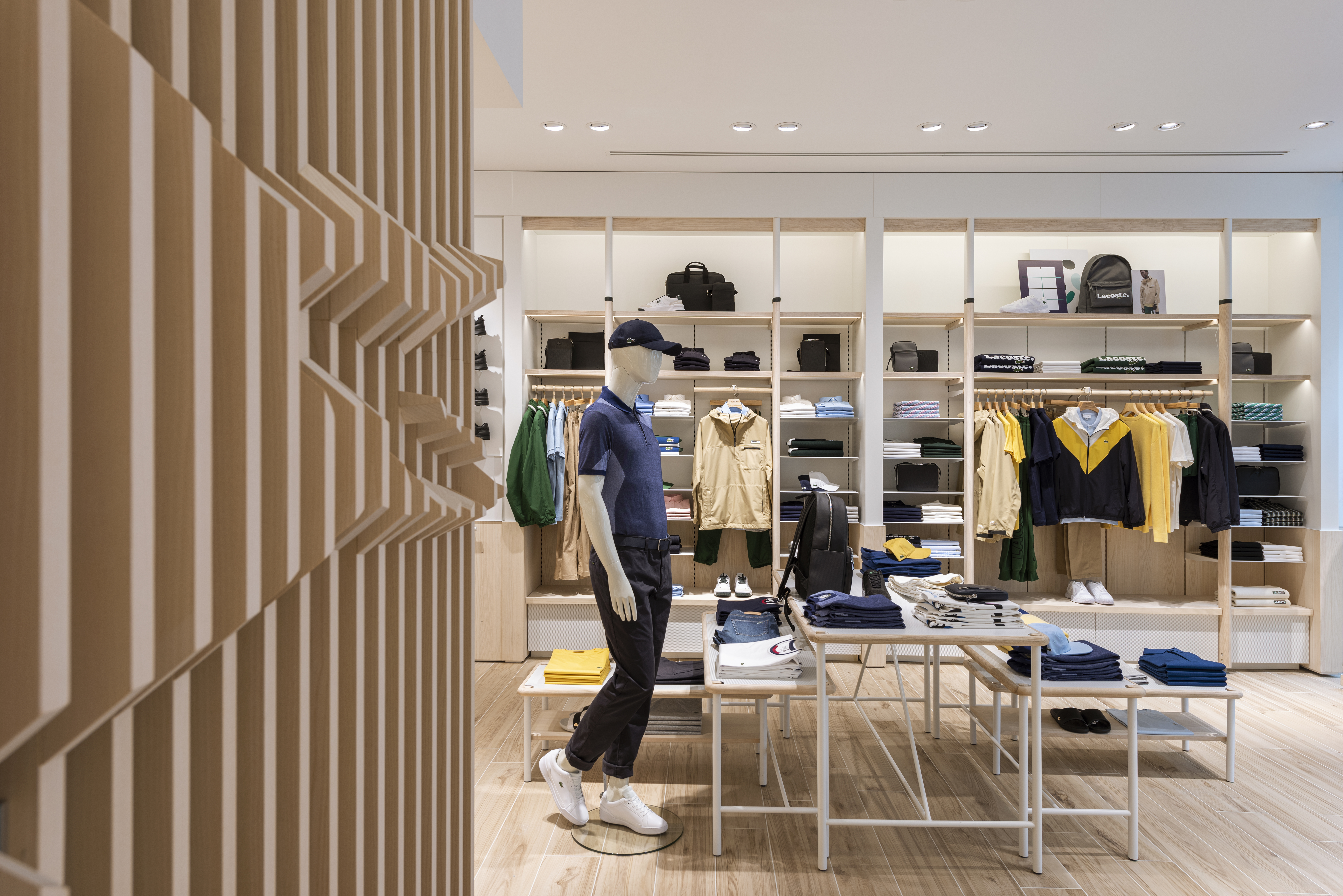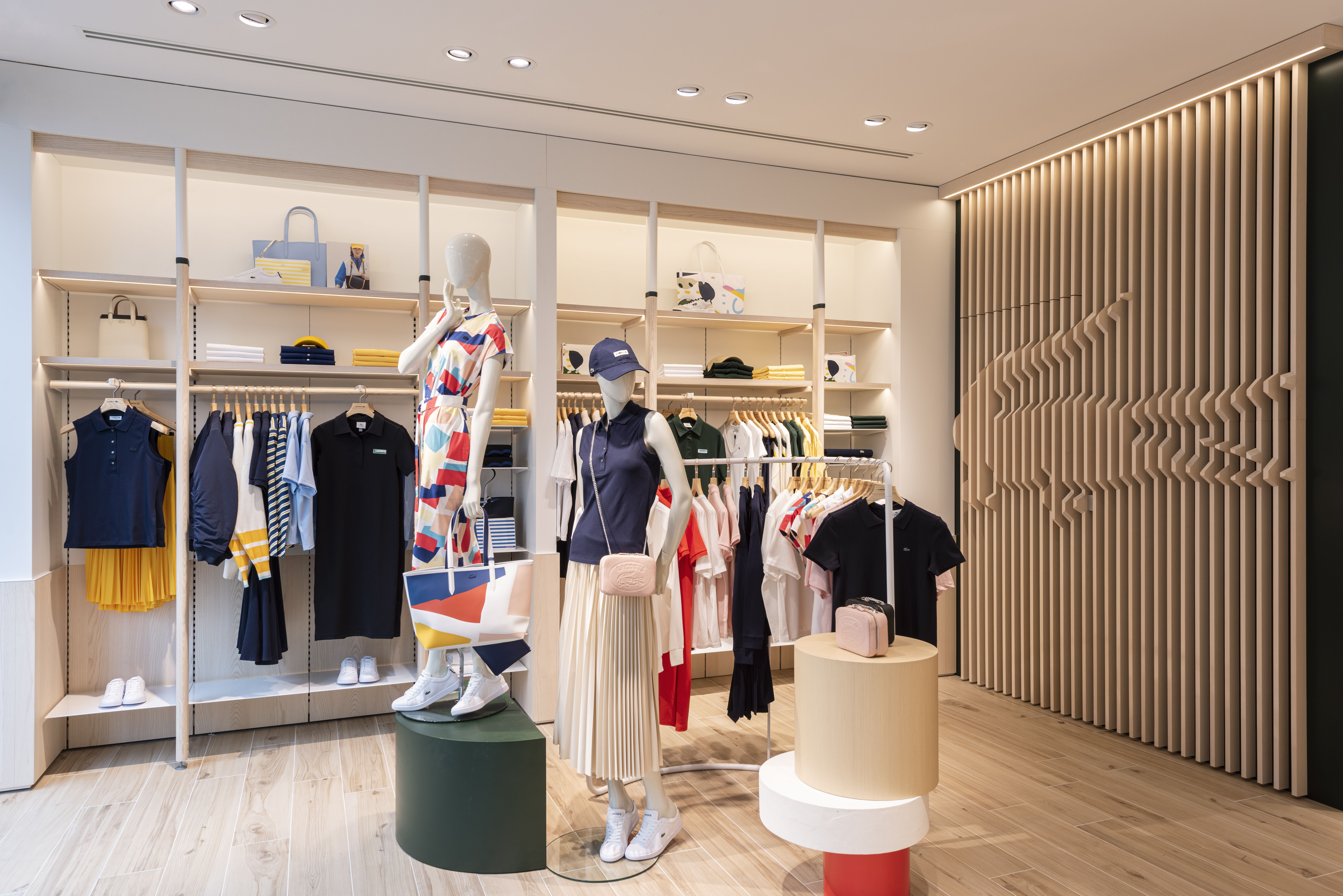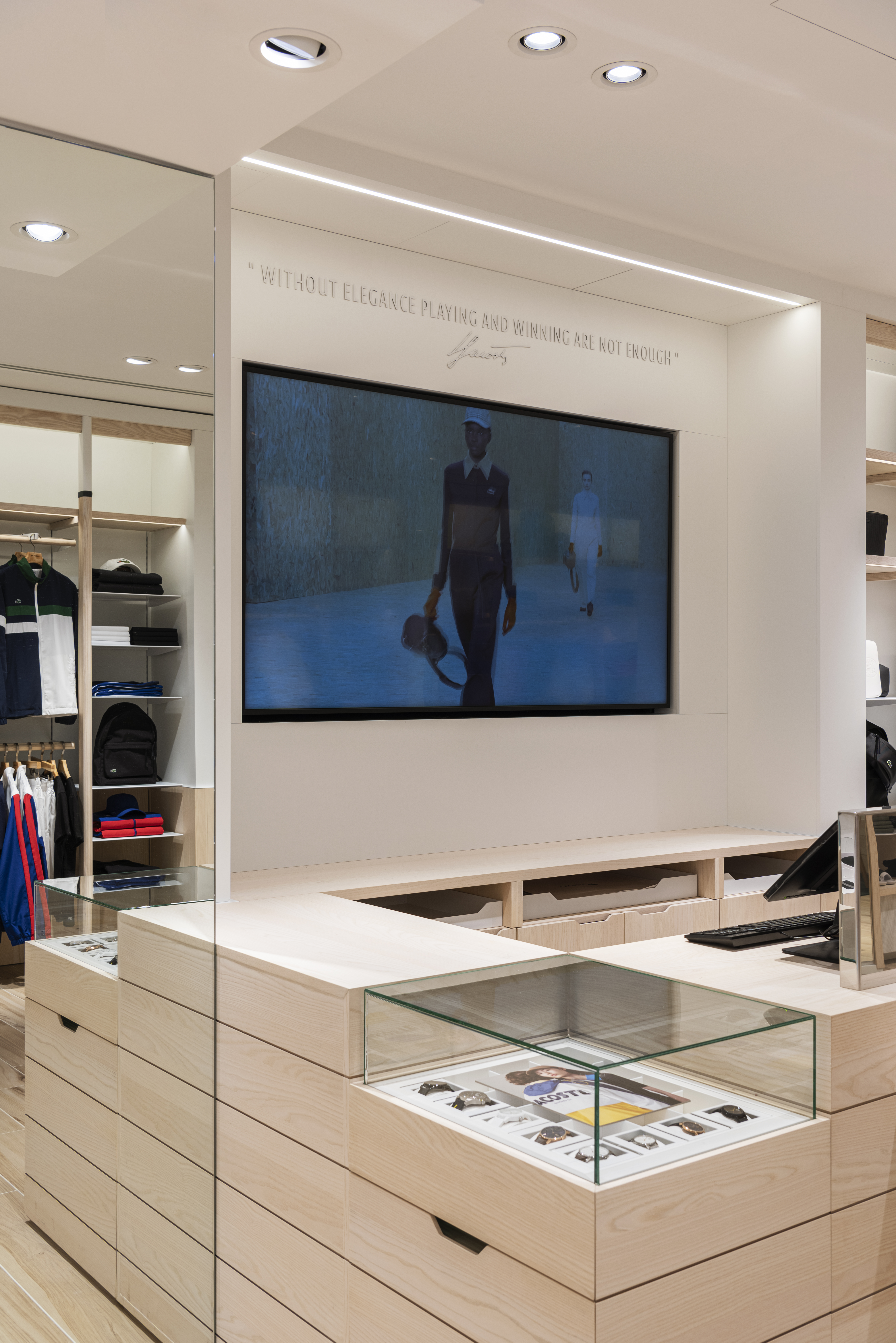 A l'intérieur, le visiteur a immédiatement l’œil attiré par le mur de polos, des étagères remplies à ras bord du vêtement le plus emblématique de Lacoste dans toutes les tailles, couleurs et coupes. Avec une superficie d'environ 150 m², le nouveau magasin abrite les différentes lignes de produits de la maison de couture française. On y trouvera notamment la célèbre collection Runway, dessinée par Louise Trotter.
