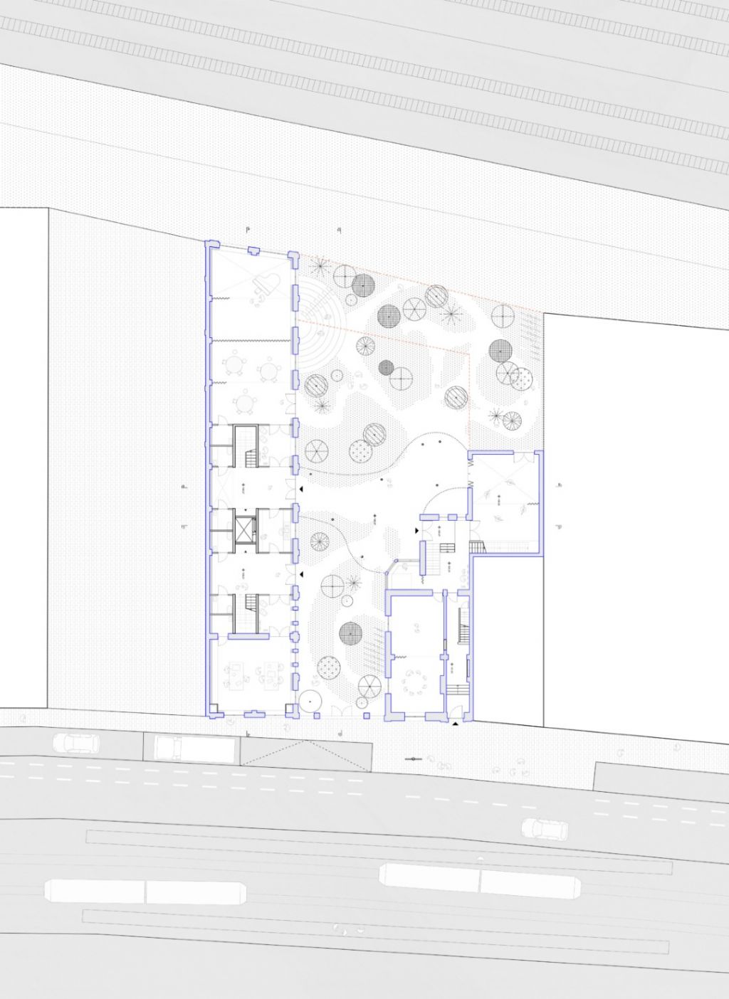 « Notre proposition porte sur un travail sobre et précis des bâtiments existant, rénovés et transformés pour les besoins du programme, en sublimant les contraintes de taille, hauteur, proportion de chaque espace pour en créer chaque fois des lieux d’activités spécifiques et identifiables comme tels », continue Pauline Tondreau. « Un nouveau jardin, dessiné en collaboration avec le paysagiste Jan Minne, sera installé en fond de parcelle, en lieu et place d’une bâtisse démolie. Un nouvel auvent connectera les deux ailes construites du site : il offrira un espace couvert pour les usagers de l’espace public en bas et une canopée par-dessus, où les enfants pourront jouer en sécurité. »