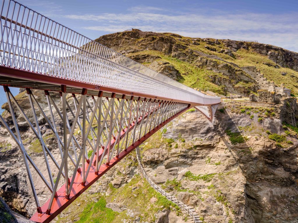 Tintagel Castle est un fort moyenâgeux situé dans les Cornouailles (Grande-Bretagne). Le 11 août 2019, on a inauguré une passerelle piétonne de 67 m et de 47,5 tonnes qui le relie à nouveau au village voisin. English Heritage, le gardien des monuments et sites, avait organisé un concours international pour concevoir une passerelle au sommet de la falaise. La liaison terrestre d’origine, disparue lors d’érosion et d’effondrements, peut ainsi être recréée grâce à cette nouvelle structure.