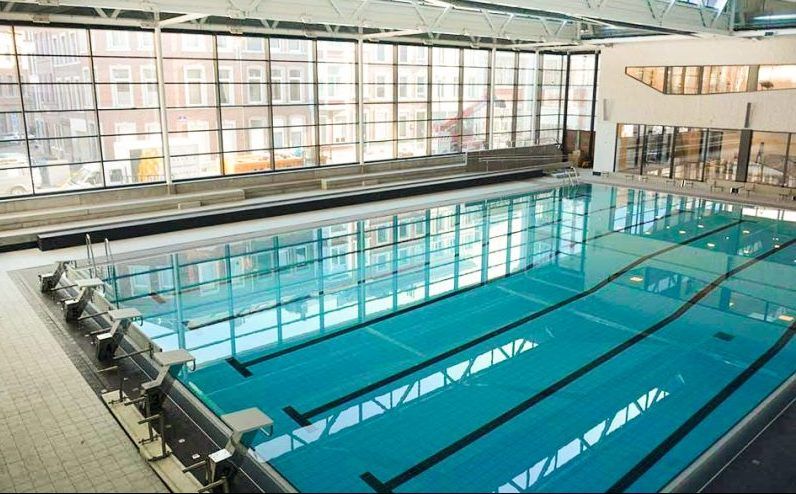 Solidement installée sur le site d’une ancienne usine devenu un temps mi-parking, mi-chancre urbain, la nouvelle piscine est constituée de trois bassins (dont un semi-olympique de 6 couloirs), d’un bassin d’apprentissage et d’une lagune de jeux et de délassement. Elle propose également des bains publics – 14 douches individuelles et 2 salles de bains complètes –, une tradition datant de la première moitié du 20e siècle et qui est remise au goût du jour ces derniers temps dans certaines piscines (notamment à Bruxelles).