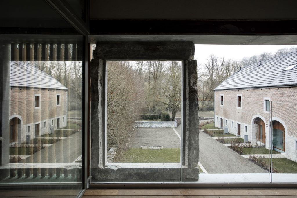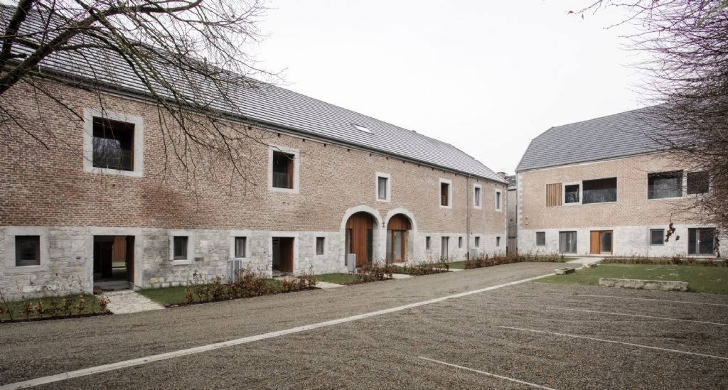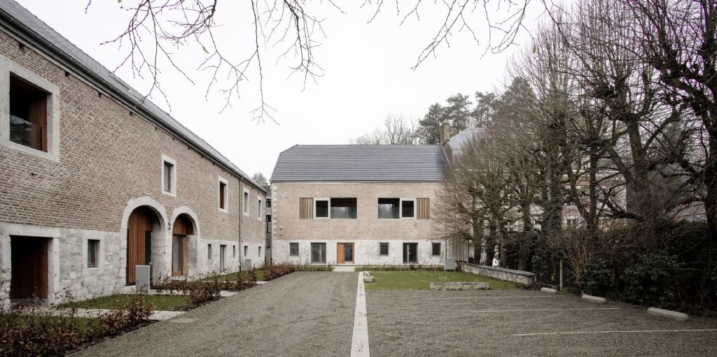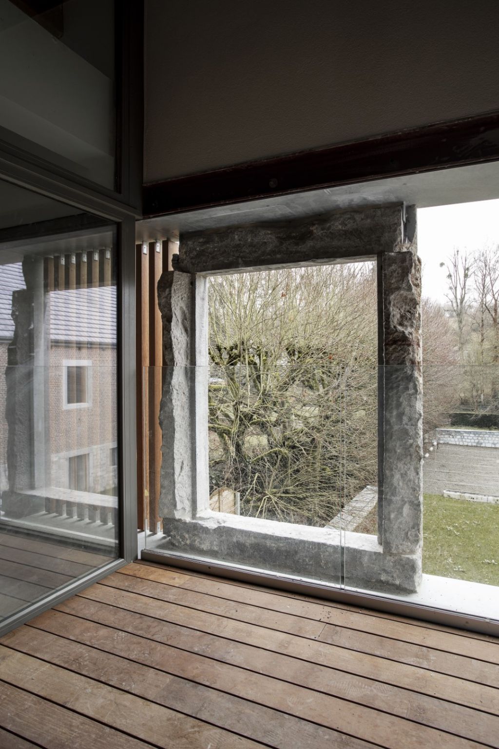 Là était le principal défi : conserver au maximum les qualités du lieu et des bâtiments tout en y développant un cadre de vie de qualité. Les façades existantes ont pu être conservées, avec leur rapport des pleins et des vides. Les architectes ont fait le choix d'ouvrir certains espaces en façade pour un apport de luminosité à l'intérieur, tout en gardant les lourds et anciens encadrements de fenêtre en pierre. On a également préservé les voûtes et la cour intérieure. « L’apport de nouveaux matériaux est donc fortement réduit », reprend Olivier Fourneau. « C’est en agissant de la sorte, en questionnant le potentiel de chaque élément existant, en place, en le respectant, que l’on évite une consommation de nouveaux produits. »