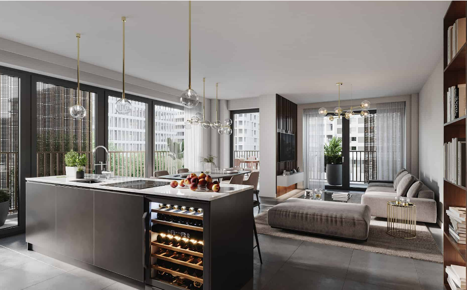 La résidence, d’une surface totale de 17.800 m2, prévoit un équilibre entre espaces privatifs et espaces de vie commune. Le programme est en effet développé pour rassembler, autour de trois noyaux, 90 appartements – studios et duplex de 1 à 3 chambres, allant de 44 à 119 m 2 – ainsi que 126 unités de coliving, sept unités commerciales et de bureaux. Les habitants pourront aussi profiter de services et d’espaces partagés comme d’un appartement réservé pour les invités, une buanderie commune, un espace de rencontre polyvalent avec une bibliothèque et une estrade, un local de réparation pour les vélos et une conciergerie.