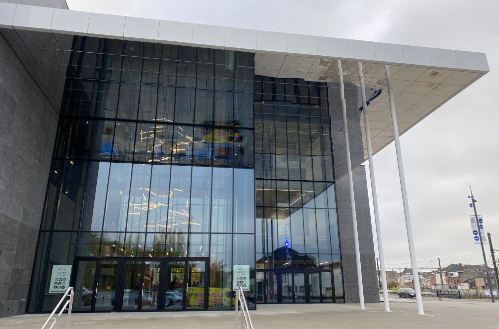 Cette plurifonctionnalité du lieu a également nécessité une étude poussée des circulations des visiteurs et des utilisateurs multiples. Il fallait assurer une accessibilité fluide et autonome à tous les lieux et à toutes les heures, certains fonctionnant quand d’autres sont fermés. La vaste esplanade, qui constitue également un espace culturel potentiel à ciel ouvert, fait office de point de rayonnement vers les différents espaces. Elle conduit le visiteur vers une façade vitrée surmontée d’un ample auvent vers lequel on converge naturellement. Cet effet d’attraction est renforcé par la transparence de cette façade qui contraste avec l’opacité des autres volumes, mais aussi par la continuité du revêtement de façade en pierre bleue identique pour l’intérieur et l’extérieur.