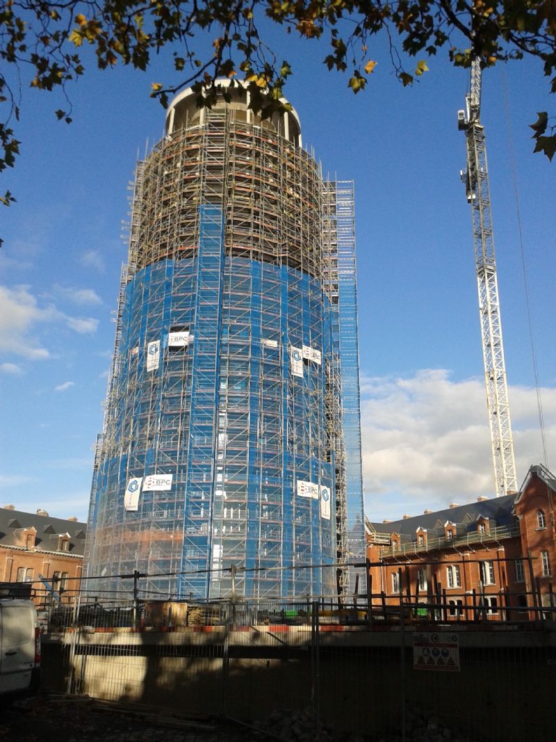 À l’extérieur, l’ossature est désormais recouverte de briques bleues, justifiant l'appellation de "tour bleue". La police locale devrait s'installer dans le bâtiment à la fin de l'été.