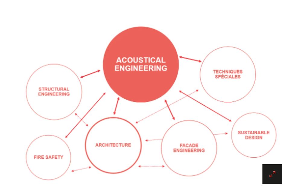 La conception acoustique d'un bâtiment concerne donc l'ensemble des lots constructifs et nécessite une coordination et une concertation entre l'architecture, les techniques spéciales, la stabilité, l'ingénierie de façade, la sécurité incendie et la durabilité. Ces cinq aspects fonctionnent en synergie, tout comme l'acoustique interagit avec les autres techniques. Intégrer l'acoustique dans un projet architectural peut être complexe, mais cela ne devient pas compliqué si ces aspects sont anticipés et coordonnés dès le début du projet.
