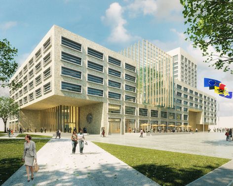 Le projet de Neutelings Riedijk Architecten est remarquable en matière de durabilité et rompt clairement avec les développements de bureaux monotones qui ont donné à notre capitale pendant de longues années une mauvaise réputation tant urbanistique qu'architecturale. Un volume affirmé dans lequel s'expriment matérialité et perméabilité organise six niveaux de bureaux autour de deux vastes jardins intérieurs. Les serres offrent un généreux espace supplémentaire au coeur du bâtiment, font entrer l'air et la lumière, et jouent un rôle important dans la régulation climatique. Côté nord, une tour procure de l'espace supplémentaire pour des bureaux, qui sont aménagés selon le principe du 'nieuwe werken', privilégiant dynamisme et flexibilité dans la répartition des espaces de travail.