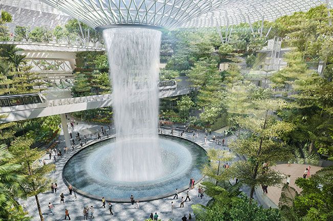 Elu pour la 7e fois consécutive meilleur aéroport du monde, l'aéroport Changi de Singapour ne se repose pas pour autant sur ses lauriers et veut renforcer son statut de hub du transport aérien en Asie. Il vient ainsi de dévoiler un nouveau complexe avec des jardins et une cascade de 40 mètres, s'écoulant d'un dôme de verre et d'acier.