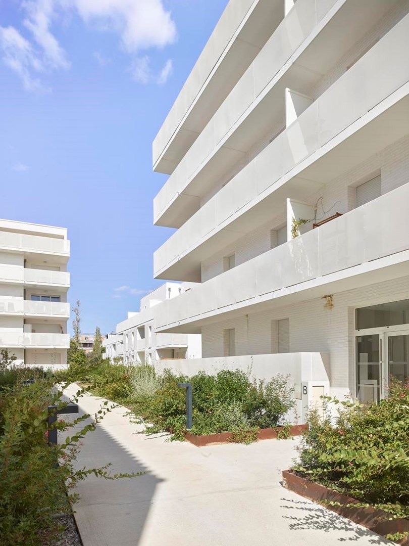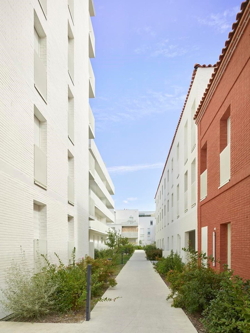 La création d’une frontalité urbaine et de porosités visuelles permet la mise en place de « pièces urbaines » sous forme de plots qui permettent d’accompagner le chemin des Izards et de garantir des perspectives sur le cœur d’ilot. La création d’une frontalité au droit de la nouvelle place réalisée par l’agence Obras, renforce le caractère urbain de ce nouvel espace public et met en valeur le caractère historique de la Maison « Fondecave ». La dualité de la brique rouge de la Maison « Fondecave » avec la brique blanche utilisée pour les bâtiments neufs, exprime ce dialogue entre modernité et devoir de mémoire afin de réconcilier les habitants avec l’urbanisme et l’architecture contemporaine.