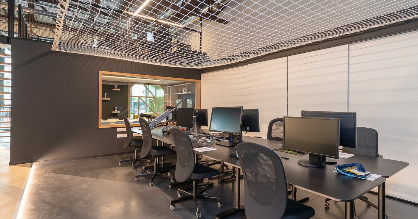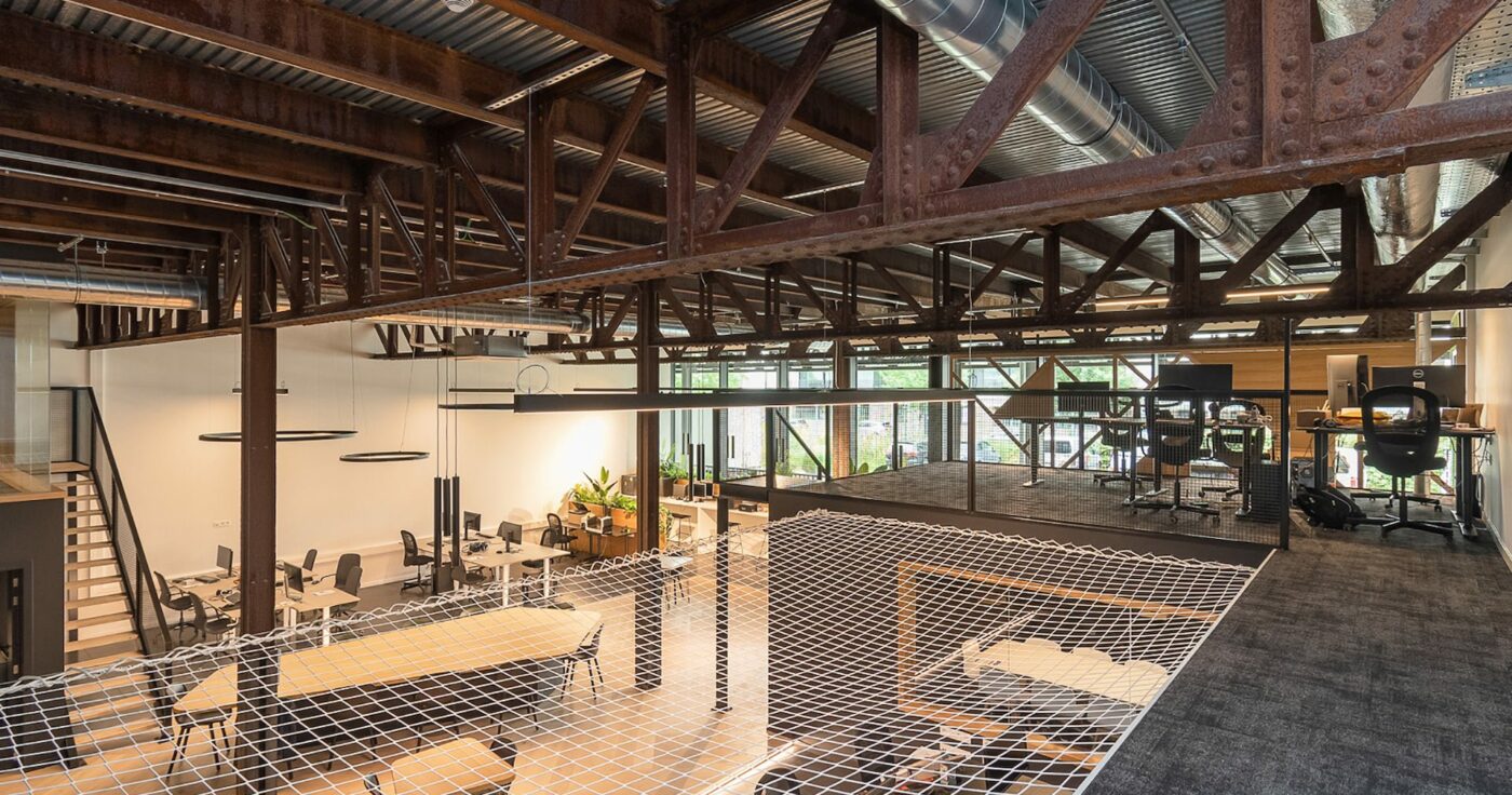 L'espace était très imposant, notamment en hauteur. « Nous l'avons divisé en différentes zones et placé trois modules duplex distincts », expliquent les architectes d'intérieur. « Une passerelle relie ces zones et nous avons délibérément omis la balustrade. C'est ce qui rend la chose excitante. Si vous tombez, vous êtes rattrapé par un gigantesque filet, qui est aussi un merveilleux endroit pour se détendre pendant ou après le travail. »
