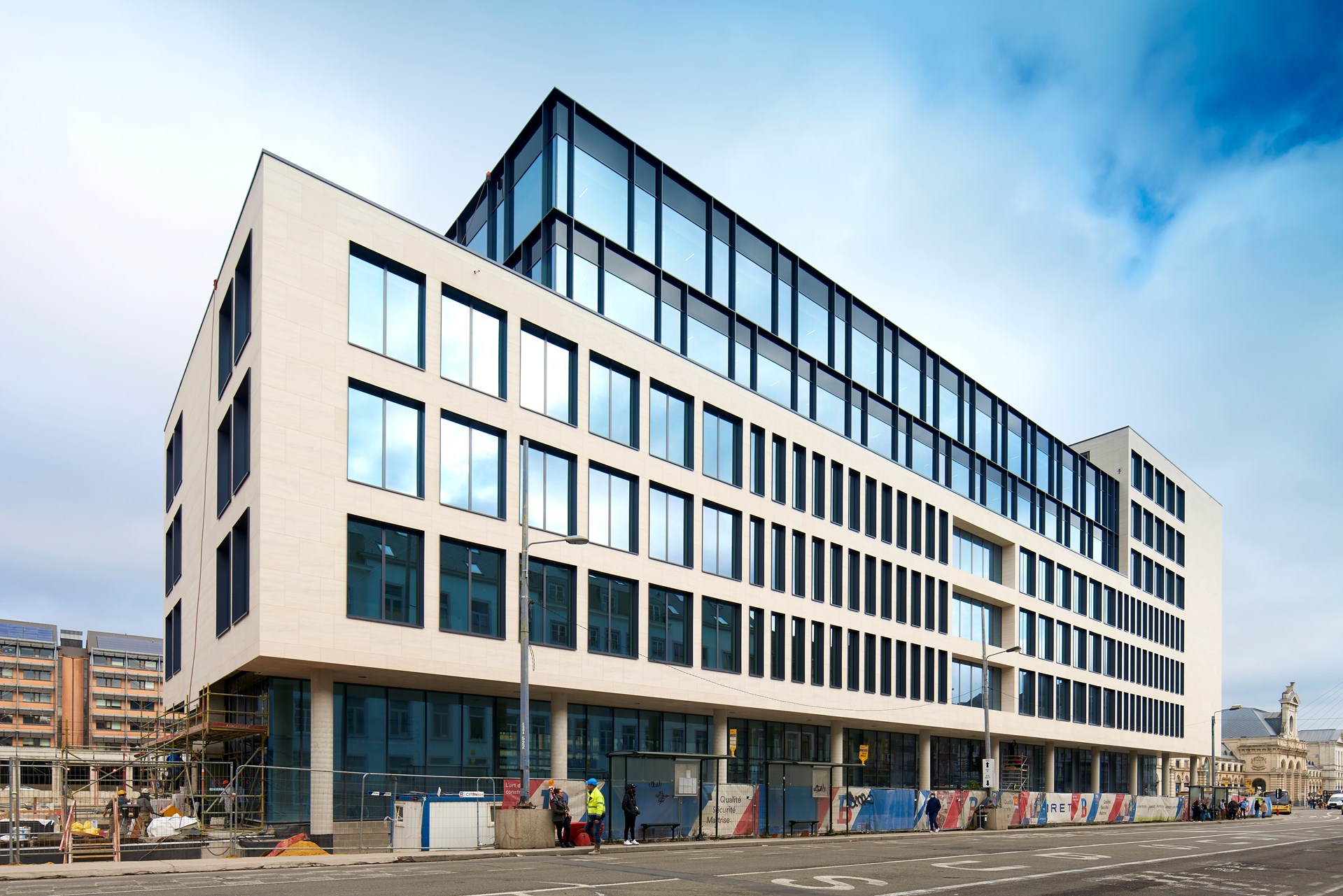 La façade est réalisée en Moca creme, une pierre calcaire portugaise que CIT Blaton a déjà mise en œuvre sur d’autres projets. « Façades, techniques spéciales et parachèvements n’ont plus de secrets pour nous, étant donné les nombreux immeubles de bureaux que nous avons déjà construits. De plus, les partenaires sur ce projet, que ce soit l’architecte ou les bureaux d’études (Pirnay pour la stabilité, VK Engineering pour les techniques, la PEB, l’acoustique et le BREEAM) ne sont pas des inconnus pour nous. »