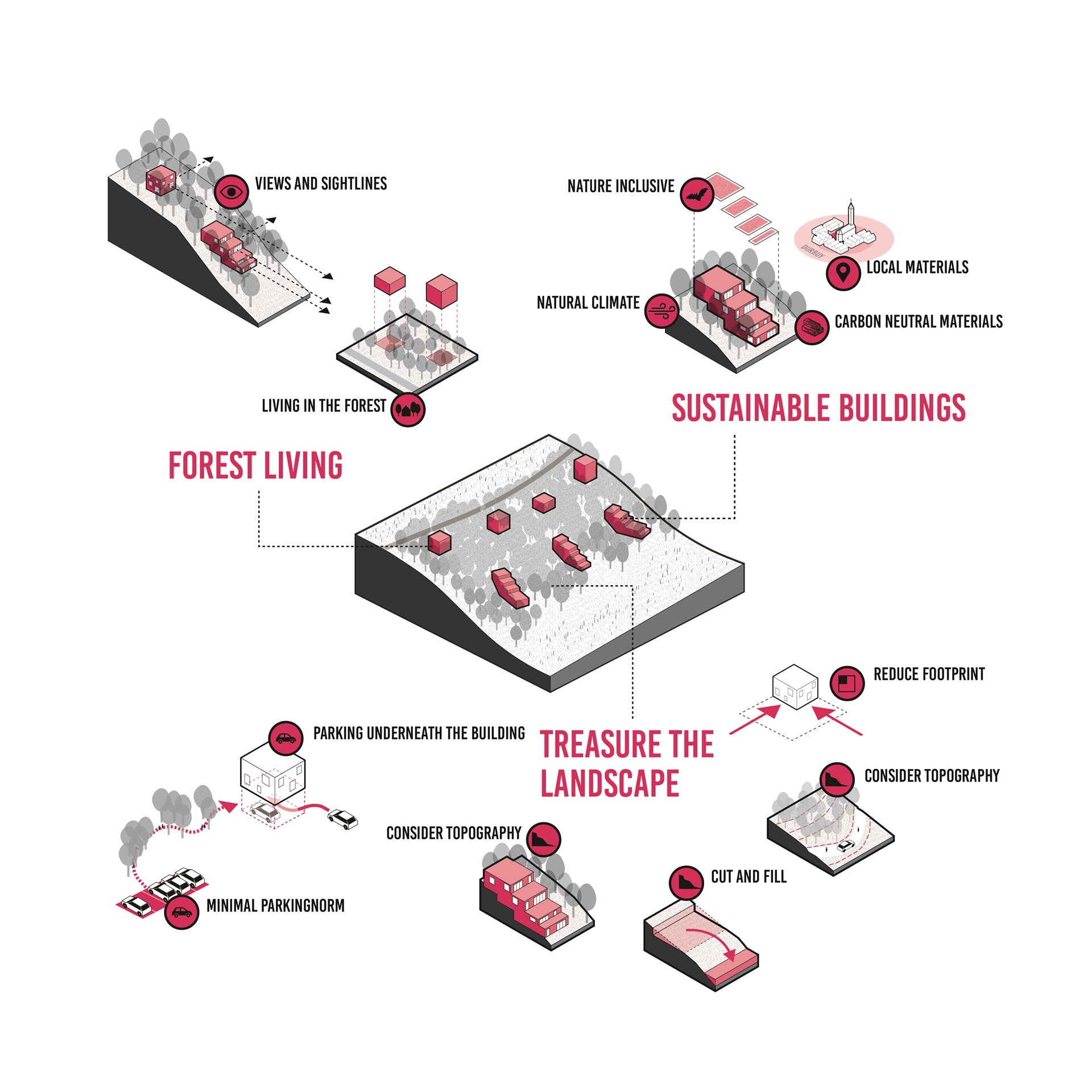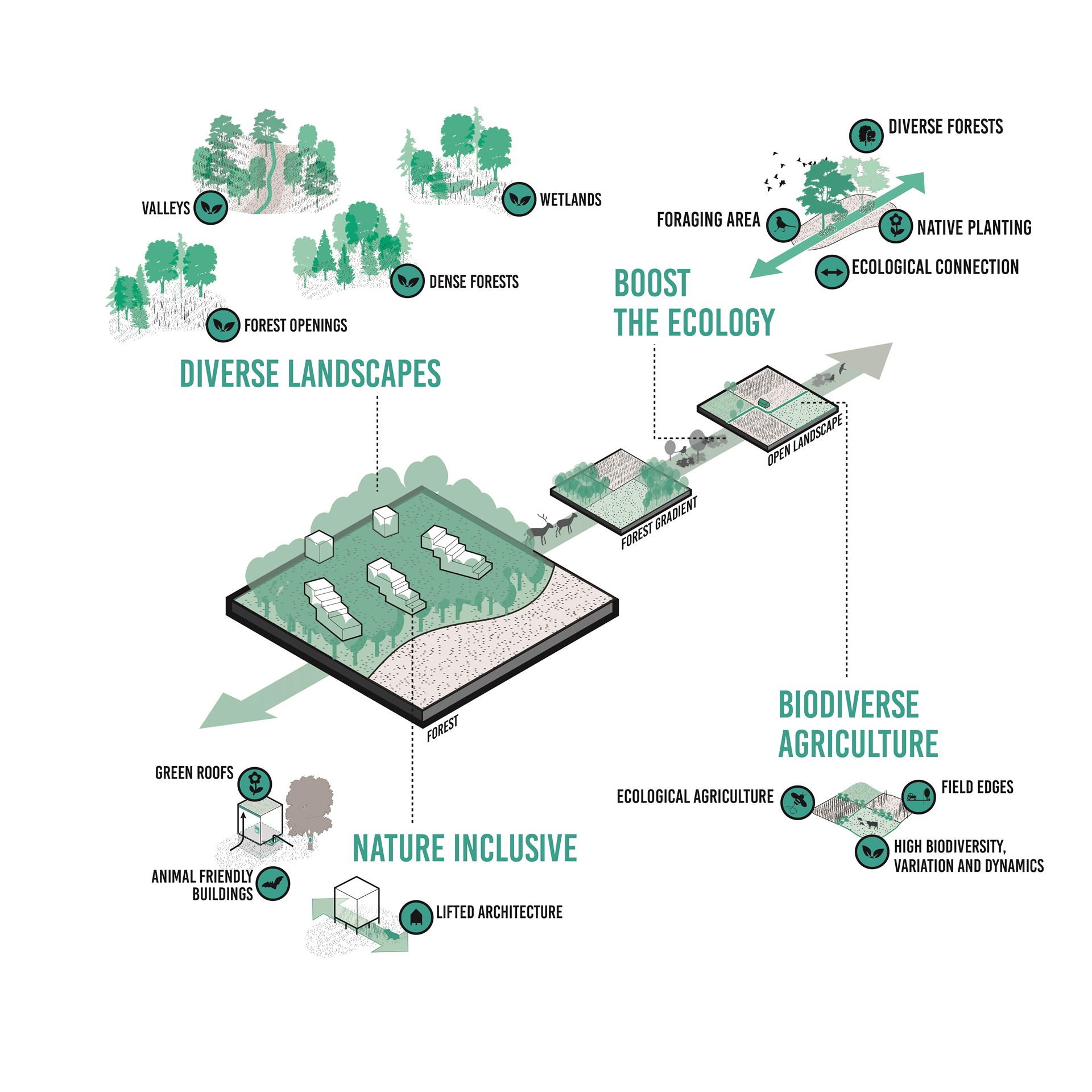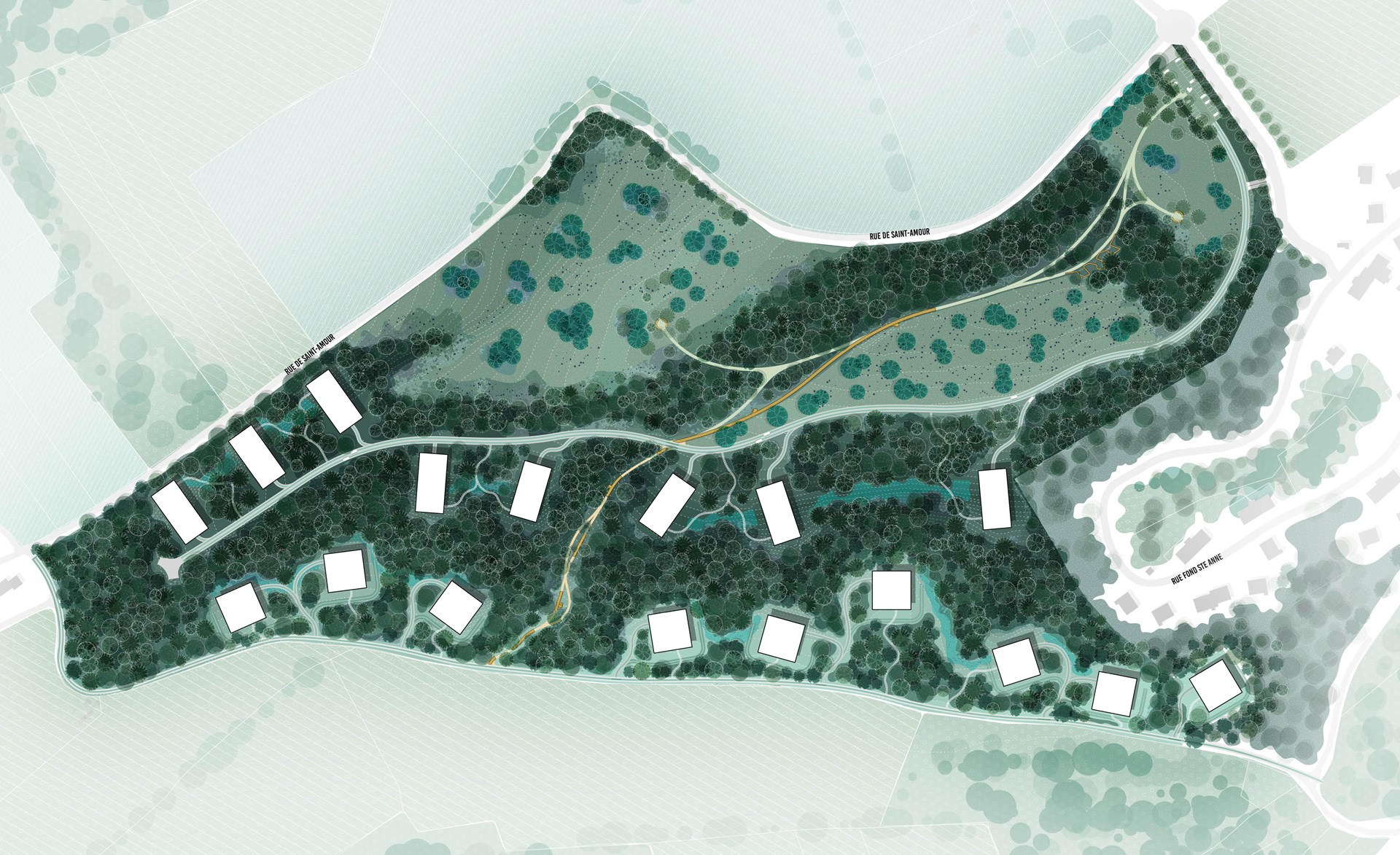 Pour DELVA Landscape Architecture & Urbanism, le paysage vient toujours en premier. Le projet ne commence pas par la création des unités résidentielles, mais par les premières actions pour favoriser le projet forestier et le développement d'un écosystème unique, avec des forêts, des zones de manteau riches, des graftes, une forêt alimentaire, des prairies fleuries ouvertes et des eaux libres. En somme, selon Steven Delva : « Un développement résidentiel comme catalyseur pour le développement naturel : voilà ce que représente le projet à Durbuy. »