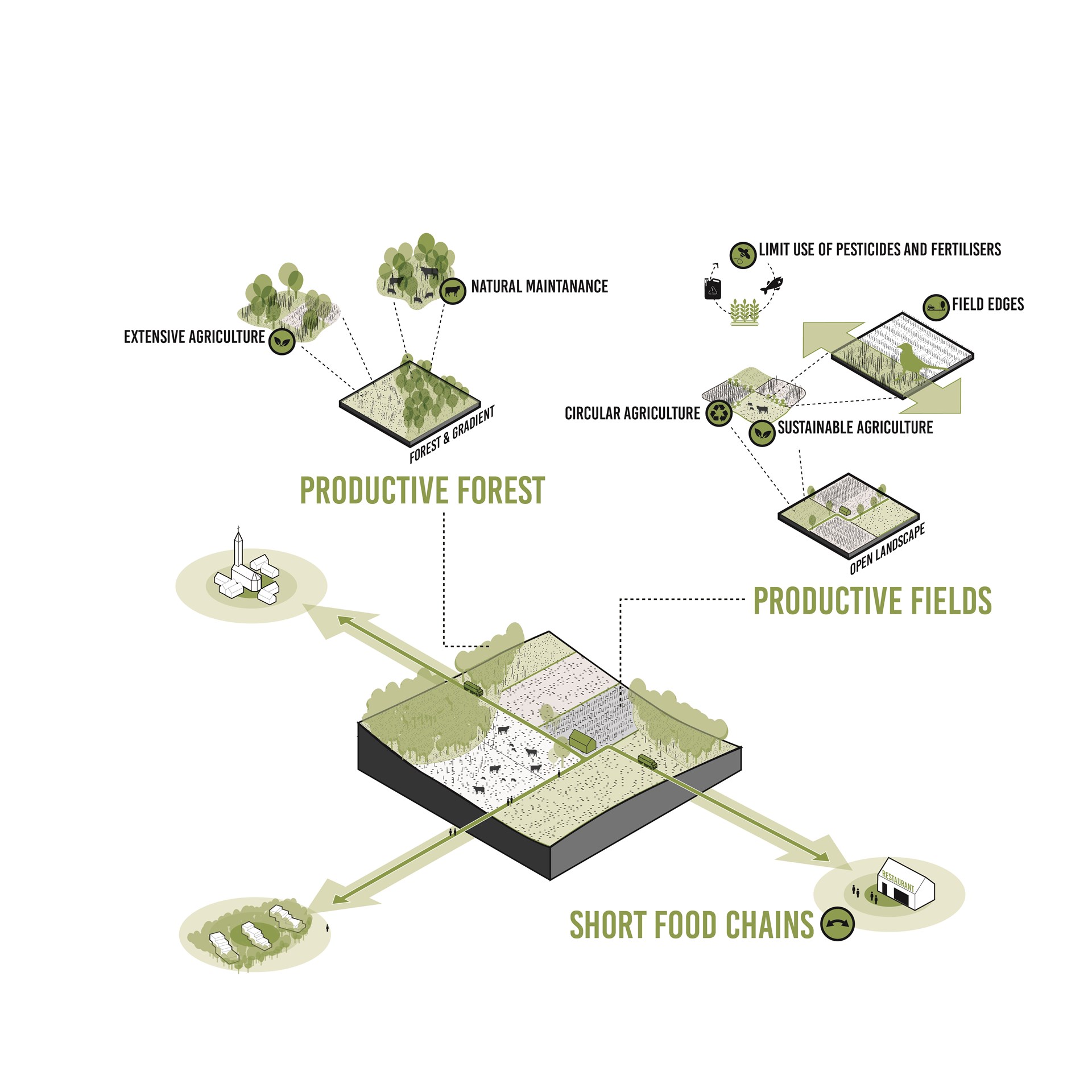 De même, les champs fertiles (riches en engrais) et les prairies subissent une transformation. Ils fournissent un biotope complémentaire en créant une dépression, une zone plus humide. Autour de cette dépression se développe une forêt alimentaire. Malgré la conservation de la fonction agricole obligatoire des terres, elles font partie d'un nouvel écosystème riche. En collaboration avec la gastronomie locale, le plan des forêts alimentaires est développé davantage.