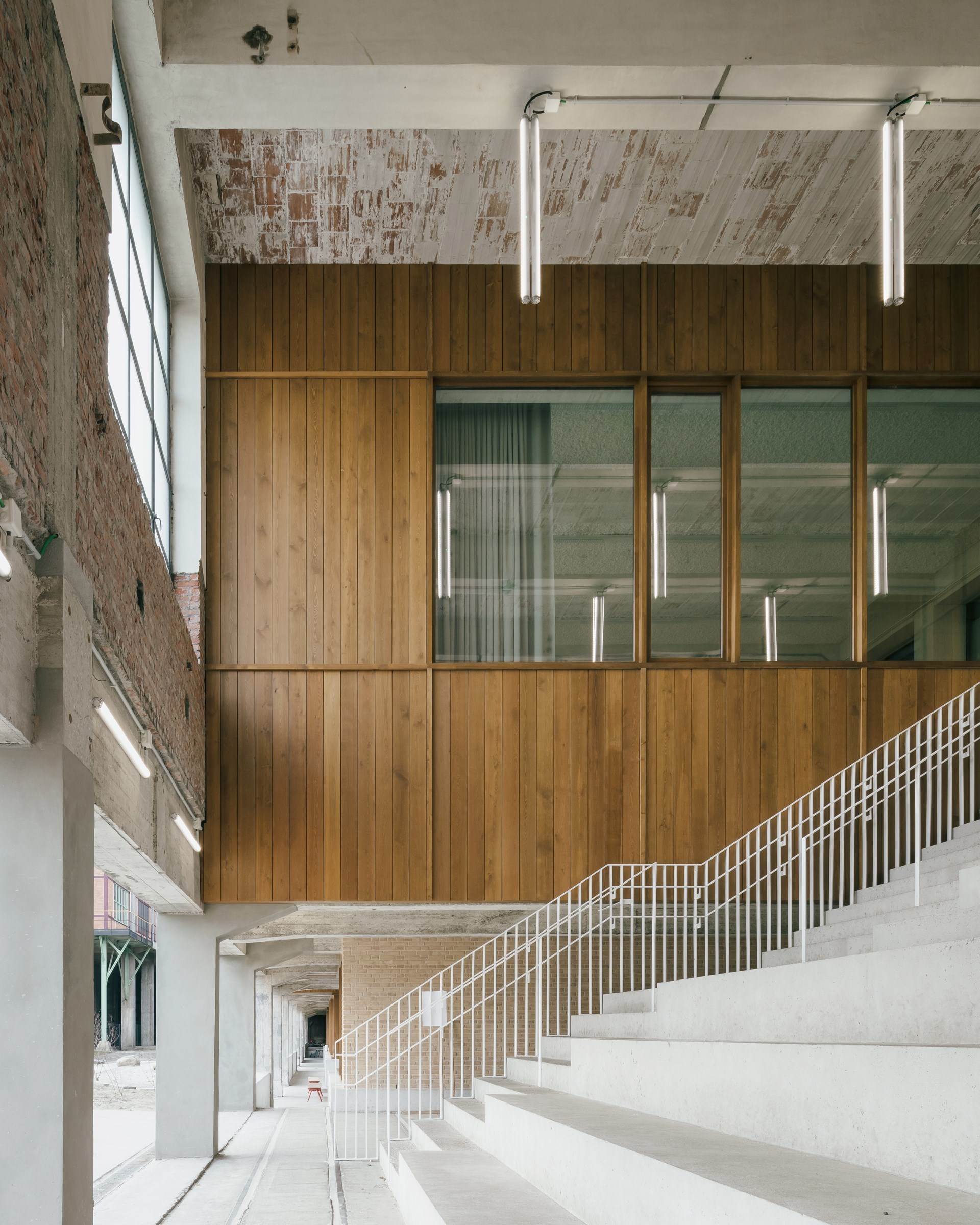 La structure qualitative et ouverte du bâtiment des vestiaires se prêtait parfaitement à la réalisation d'une infrastructure éducative contemporaine et moderne, conçue comme un vaste environnement d'apprentissage et de vie. « Nous avons essayé de préserver au maximum l'atmosphère et la matérialité du bâtiment », explique Stefaan Evers, architecte-associé chez a2o-architecten, qui a collaboré avec AAC Architecture. « L’enveloppe extérieure avait déjà été restaurée avant que ce projet ne prenne forme, nous n'avons donc rien changé. Et comme la structure en béton existante était encore en bon état, nous l'avons utilisée avec reconnaissance comme point de départ pour la réalisation du nouveau programme et avons essayé de la mettre en valeur de la manière la plus pure possible. La seule intervention structurelle majeure a été la création de trois vides spacieux, dans lesquels nous avons également placé plusieurs nouveaux escaliers. »