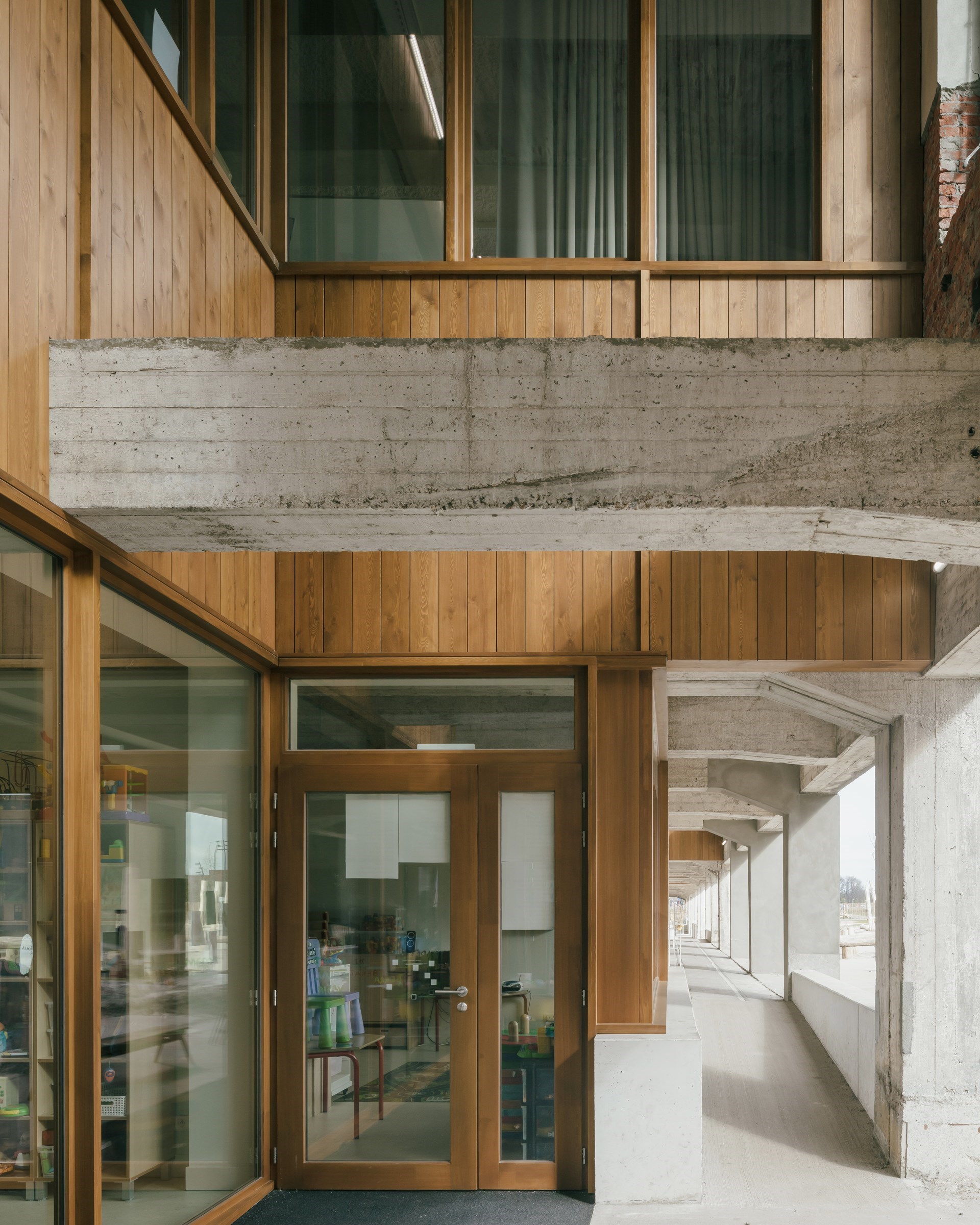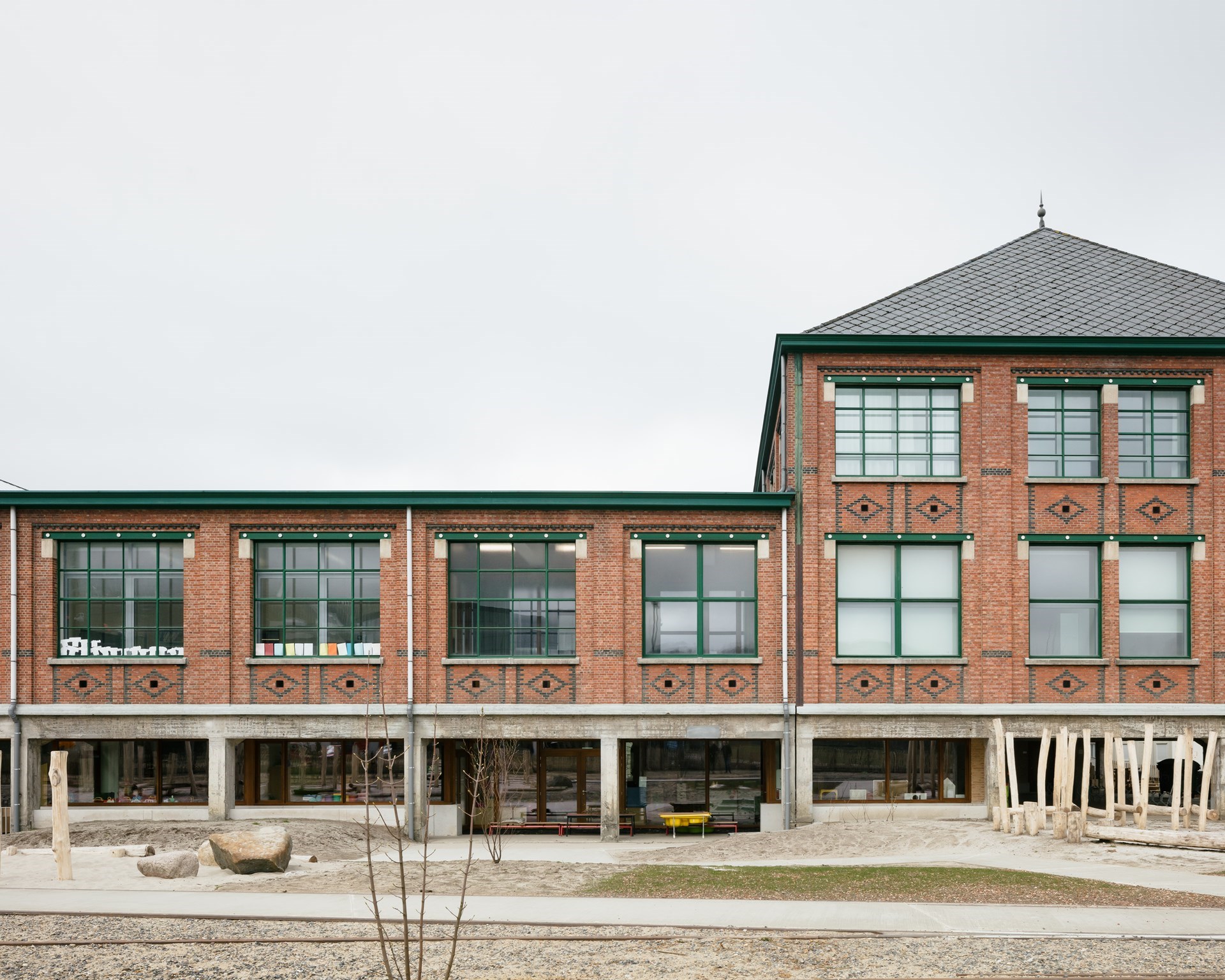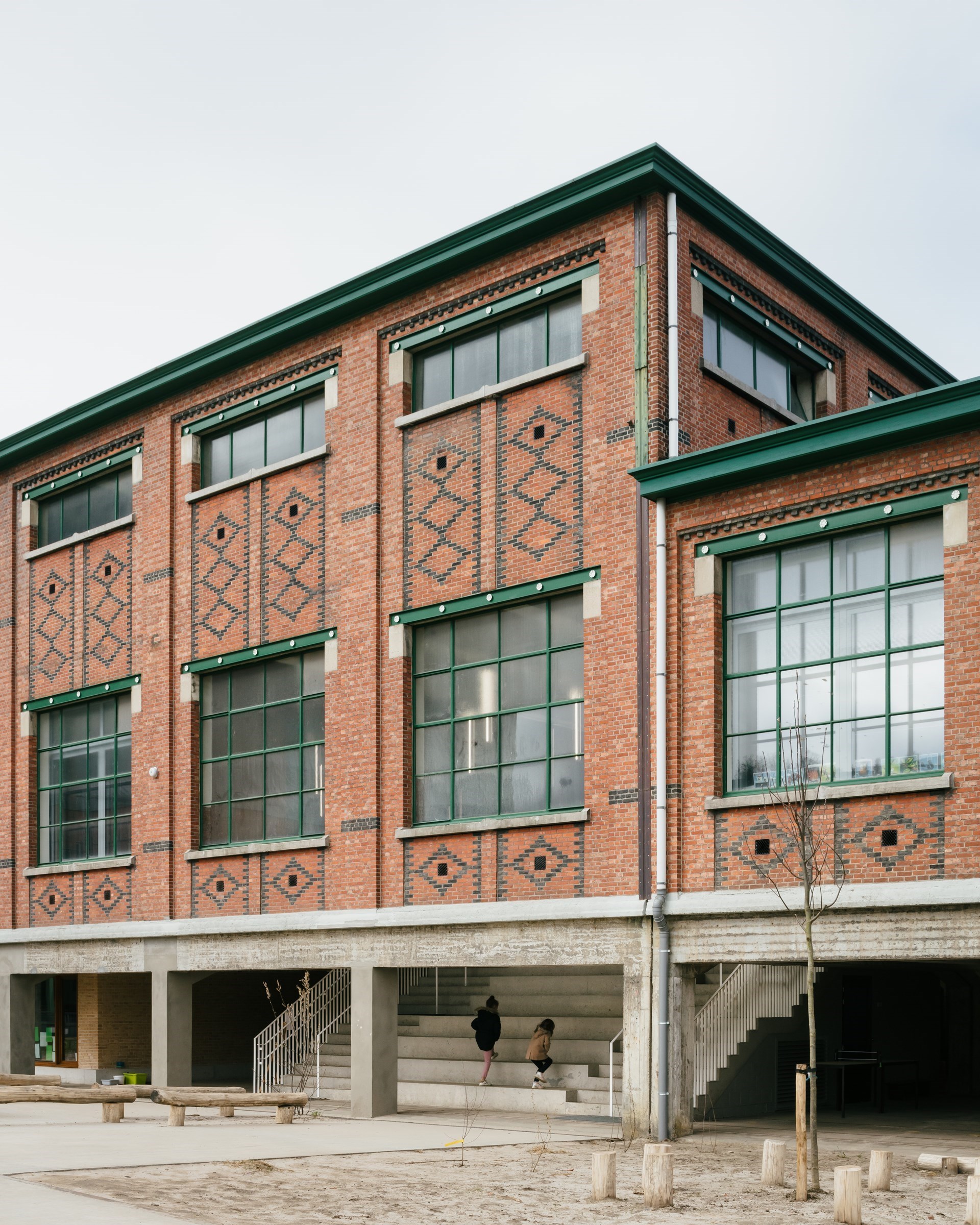 Les vides dans la façade créent une interaction passionnante entre les différents étages et les salles de classe. Cela permet également de créer une zone extérieure couverte pour la section maternelle, qui mène à une aire de jeux extérieure aventureuse. « Celle-ci est délimitée par une nouvelle piste cyclable et est intégrée le plus naturellement possible, en accord avec l'âme industrialo-historique du site. Les enfants peuvent se défouler dans un véritable parc de jeux, dans lequel sont intégrés des vestiges du passé (comme une ancienne voie ferrée). De cette façon, ils entrent en contact avec le patrimoine historique de manière informelle. En bref : l'histoire n'est pas balayée par le projet. Au contraire, l'environnement scolaire ne fait que s'ajouter au contexte existant », souligne Stefaan Evers. « Il est agréable de voir comment l'ancien et le nouveau entrent en dialogue et se renforcent mutuellement. À l'intérieur du bâtiment, nous avons délibérément choisi des accents de bois chaleureux et des couleurs ludiques pour contrebalancer la structure en béton brut. Il est important de savoir que nous avons conçu les écoles de manière à ce que toutes les interventions architecturales soient réversibles, afin que le complexe puisse facilement recevoir une nouvelle fonction à l'avenir. Nous sommes honorés d'avoir pu "emprunter" la structure existante pour ce beau projet ! »