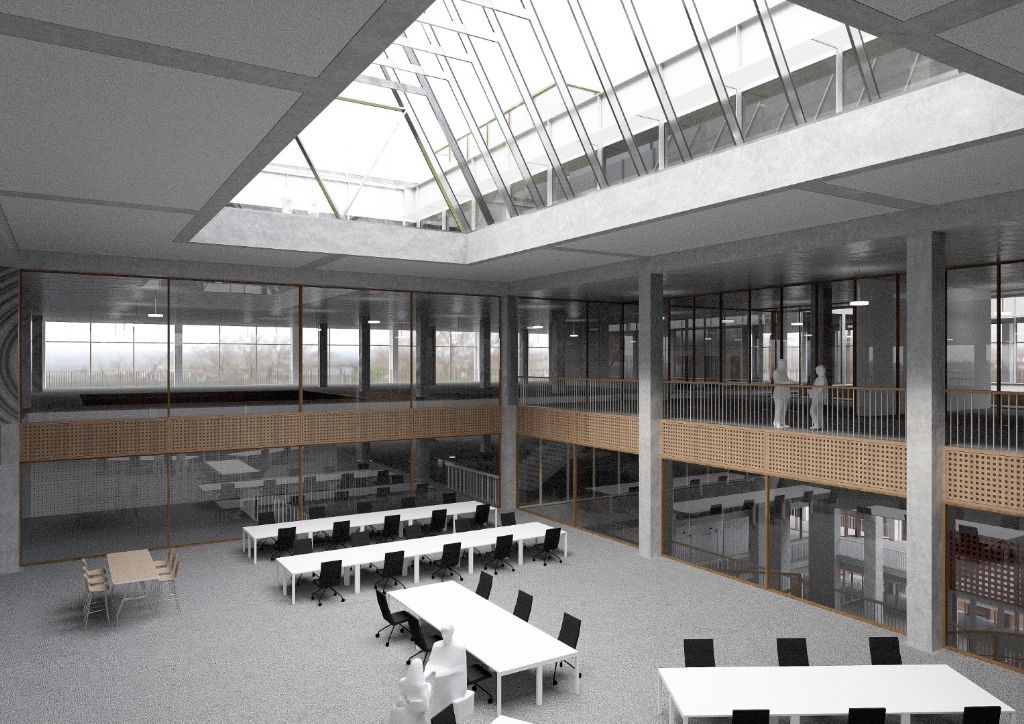 Avec son volume de 80 m sur 80 m, ce bâtiment compact proposera des espaces intérieurs permettant la proximité des lieux de production, des rédactions et des bureaux administratifs. Le cœur du bâtiment, occupé par un vaste duplex de 8000 m2 dédié à la newsroom, sera éclairé par une verrière. Le bâtiment répondra aux critères passifs tout en offrant des volumes et des surfaces vitrées inhabituelles dans le monde de la construction tertiaire.