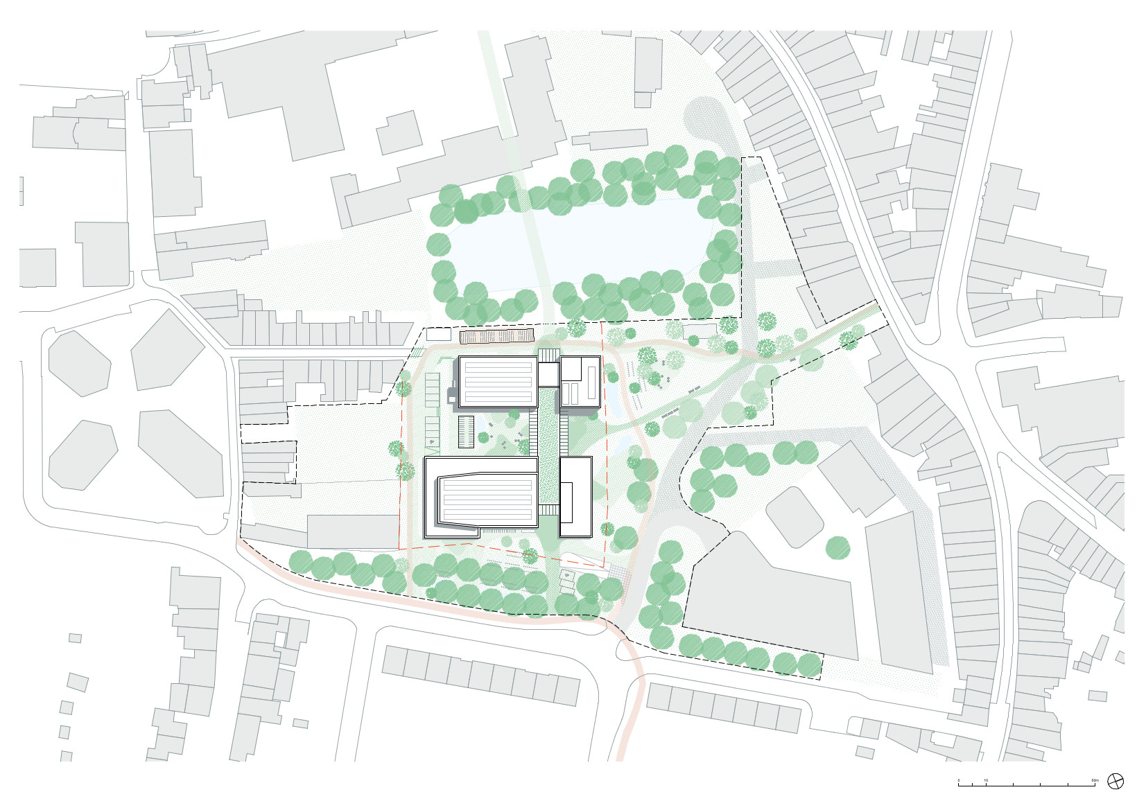 ""Au milieu d'une vaste zone à aménager, entre le Rupel et le centre-ville, quelques bâtiments plutôt tape-à-l'œil doivent être construits juste à côté d'anciennes maisons d'ouvriers dans les vestiges de l'ancienne industrie de la brique. Au centre du site, un nouveau centre culturel et une académie de musique seront construits sur les anciennes carrières d'argile. Nous essayons d'aborder la mission principalement sous l'angle du paysage, avec un parc comme facteur de liaison dans ce nouvel ensemble"."