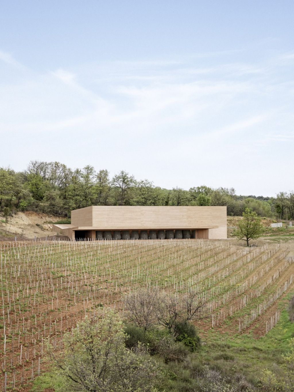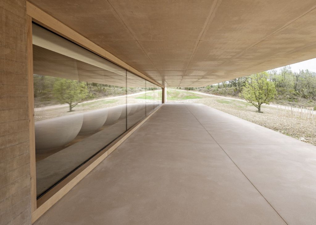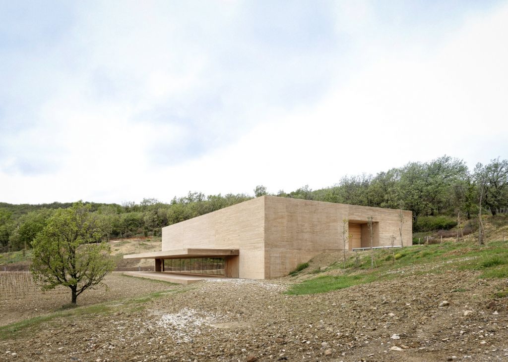 Le bâtiment, coulé en béton coffré de planchettes en bois, à l’ancienne, a été teinté dans la masse de la même couleur ocre que les terres rocheuses de la région, lui conférant une texture végétale. Sa forme, légèrement évasée, semble sortir de terre et évoque un mastaba de l’antiquité. Dès l’arrivée, on est frappé par un alignement monumental de cuves tulipes en béton que l’on distingue à travers les vitres bordant la terrasse. Cet écran panoramique aspire dans ses reflets les lignes de vignes en contrebas et rend lisible la fonction de l’édifice au premier coup d’œil.