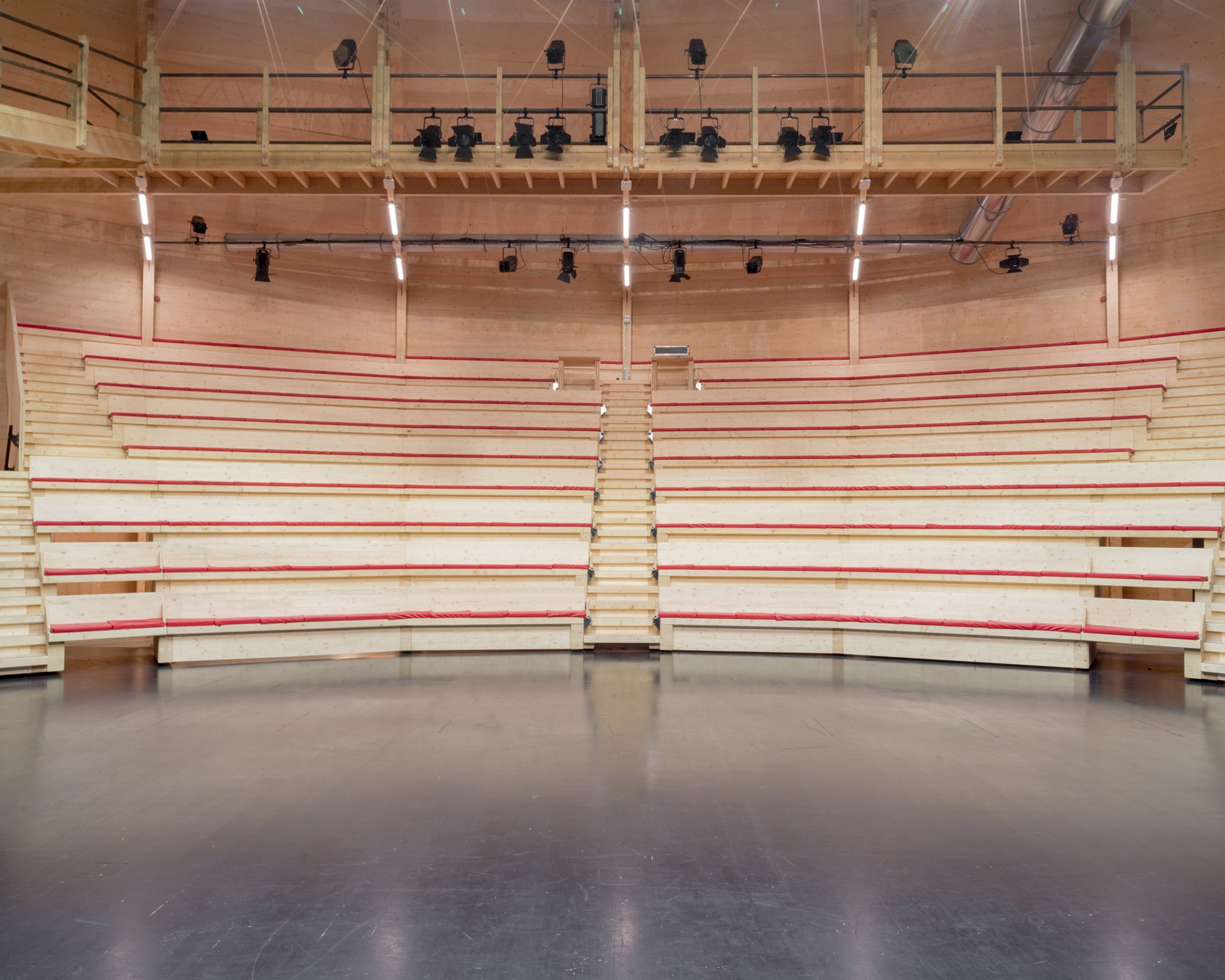 Il y a eu une volonté de tout faire en bois, avec des matériaux locaux, donc travailler vraiment en circuit court. Et c'est comme ça qu'on se retrouve après, avec un volume assez simple en bois qui a été emballé d'un bardage bois qui vient se poser dessus. Et je terminerai en disant que ce qui est vraiment important dans les arts Circassiens, c'est cette proximité entre le public et la scène. Et donc on a un gradin très vertical où le public est en masse et vient vraiment épouser la scène pour qu'il y ait ce match entre l'acteur et son public."