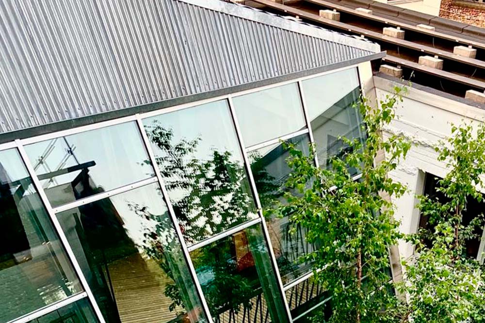 3. Offrir des espaces conviviaux et agréables par la création d‘une verrière abritant l’atrium central, une métaphore d’un dôme de verre pour la coupole d’ONG’s qu’est le CNCD-11.11.11, articulant avec le grand escalier tout le projet : circulation, repos, cafétéria et espaces de bureaux s’organisant autour du volume suivant l’adage «tous ensemble mais chacun chez soi». Outre les bureaux modulables et les lieux de travail flexibles et informels imaginés par l’architecte dans les espaces de circulations, le toit d’origine a été renforcé pour recevoir un ultime lieu pour ses usagers: un jardin d’entreprise et potager fleuri, en attente de subsides.