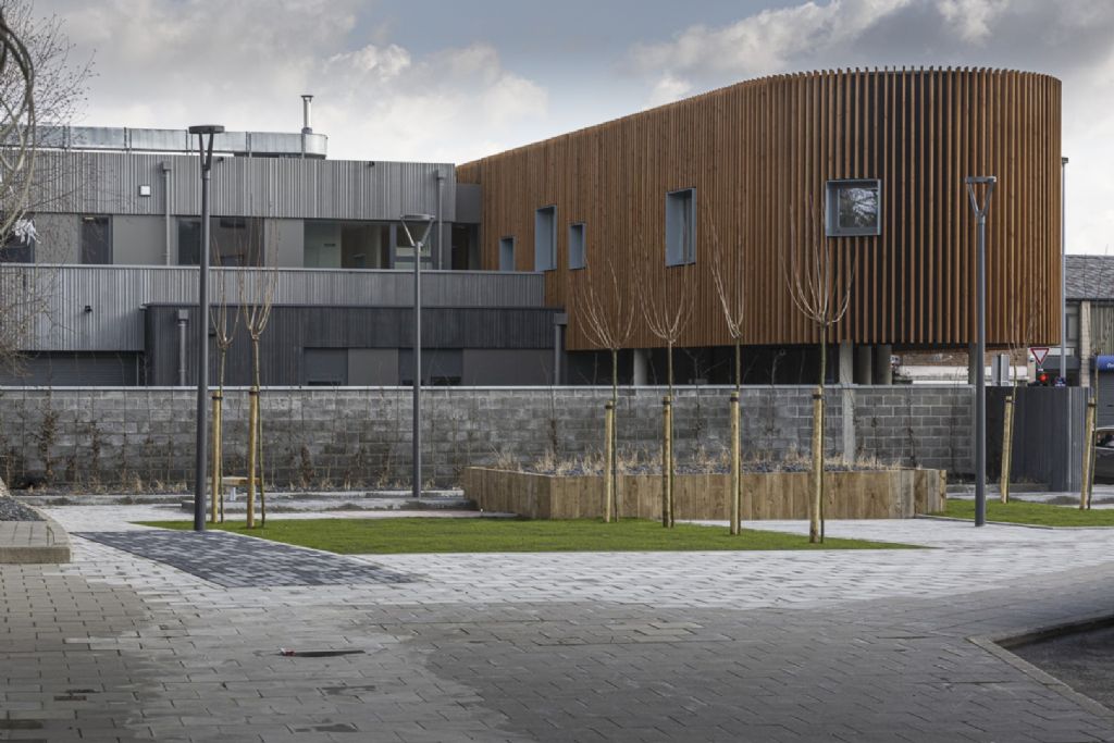 Une autre volonté du maître d’ouvrage était d’aménager l’espace public voisin, afin d’offrir à la population un ensemble cohérent, bénéfique pour tous. « Architecturalement, l’aménagement de cet espace est la continuité des lignes de force du bâtiment, il est dynamique, ludique, durable et architecturé », précisent les architectes d'AAEG. « L’ensemble se décline en une suite d’espaces minéraux et d’espaces verts. La végétation, de type régional, structure les espaces et renforce les intentions d’aménagement. Ces aménagements architecturent l’espace ou jouent un rôle sécuritaire vis-à-vis du commissariat. »